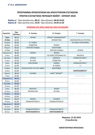 ΚΑΙ ΑΠΟΛΥΤΗΡΙΩΝ ΕΞΕΤΑΣΕΩΝ ΠΡΩΤΗΣ ΕΞΕΤΑΣΤΙΚΗΣ ΠΕΡΙΟΔΟΥ ΜΑΪΟΥ - ΙΟΥΝΙΟΥ 2018 Βάρδια α΄: Ώρα προσέλευσης, 08:15 - Ώρα εξέτασης, 08:20-10:20 Βάρδια β΄: Ώρα προσέλευσης, 10:20 - Ώρα εξέτασης, 10:30-12:30 ΠΡΟΣΟΧΗ ΣΤΙΣ ΩΡΕΣ ΕΝΑΡΞΗΣ ΤΩΝ ΕΞΕΤΑΣΕΩΝ! Ημερ/νία Ώρα Εξέτασης Α΄ Λυκείου Β΄ Λυκείου Γ΄ Λυκείου Τρίτη 08:20 ΑΡΧΑΙΑ ΑΡΧΑΙΑΑΣ -ΜΑΘΗΜΑΤΙΚΑΘΣ 29-Μαϊ 10:30 ΘΡΗΣΚΕΥΤΙΚΑ ΜΑΘΗΜΑΤΙΚΑ & ΣΤΑΤΙΣΤΙΚΗ Τετάρτη 08:20 Ν. ΓΛΩΣΣΑ Ν.ΓΛΩΣΣΑ-ΛΟΓΟΤΕΧΝΙΑ 30-Μαϊ 10:30 ΓΕΩΜΕΤΡΙΑ ΙΣΤΟΡΙΑ Πέμπτη 08:20 ΠΟΛΙΤΙΚΗ ΠΑΙΔΕΙΑ ΛΟΓΟΤΕΧΝΙΑ 31-Μαϊ 10:30 ΠΟΛΙΤΙΚΗ ΠΑΙΔΕΙΑ ΙΣΤΟΡΙΑ Παρασκευή 08:20 ΧΗΜΕΙΑ ΦΥΣΙΚΗ 1-Ιουν 10:30 ΕΙΣ ΑΡΧΕΣ ΕΠΙΣΤΗΜΗΣ Η/Υ ΒΙΟΛΟΓΙΑ Δευτέρα 08:20 ΙΣΤΟΡΙΑ ΒΙΟΛΟΓΙΑ ΕΠΑΝΑΛΗΠΤΙΚΕΣ Γ΄ 4-Ιουν 10:30 ΑΓΓΛΙΚΑ ΓΕΩΜΕΤΡΙΑ >> Τρίτη 08:20 ΛΟΓΟΤΕΧΝΙΑ ΧΗΜΕΙΑ ΕΠΑΝΑΛΗΠΤΙΚΕΣ Γ΄ 5-Ιουν 10:30 Ν.ΓΛΩΣΣΑ >> Τετάρτη 08:20 ΕΠΙΛΟΓΕΣ (ΘΤΡ-Η/Υ-ΕΕΠ-ΓΔΦΠ) ΦΙΛΟΣΟΦΙΑ 6-Ιουν 10:30 ΑΠΟΤΕΛΕΣΜΑΤΑ Γ΄ Πέμπτη 08:20 ΑΛΓΕΒΡΑ ΒΑΚΕΑΣ -ΦΥΣΙΚΗΘΣ 7-Ιουν 10:30 ΠΑΝΕΛΛΑΔΙΚΕΣ Παρασκευή 08:20 ΝΕΟΕΛΛΗΝΙΚΗ ΓΛΩΣΣΑ ΓΠ 8/6 8-Ιουν 10:30 Δευτέρα 08:20 ΑΡΧΑΙΑ - ΜΑΘΗΜΑΤΙΚΑ 11/6 11-Ιουν 10:30 Τρίτη 08:20 ΒΙΟΛΟΓΙΑ ΑΡΧΑΙΑ 12-Ιουν 10:30 ΘΡΗΣΚΕΥΤΙΚΑ ΑΓΓΛΙΚΑ Τετάρτη 08:20 ΙΣΤΟΡΙΑ - ΦΥΣΙΚΗ - ΑΕΠΠ 13/6 13-Ιουν 10:30 Πέμπτη 08:20 ΦΥΣΙΚΗ ΑΛΓΕΒΡΑ 14-Ιουν 10:30 ΕΠΑΝΑΛΗΠΤΙΚΕΣ Α΄ ΕΠΑΝΑΛΗΠΤΙΚΕΣ Β΄ Παρασκευή 08:20 ΛΑΤΙΝΙΚΑ - ΧΗΜΕΙΑ - ΑΟΘ 15/6 15-Ιουν 10:30 Δευτέρα 08:20 ΕΠΑΝΑΛΗΠΤΙΚΕΣ Α΄ ΕΠΑΝΑΛΗΠΤΙΚΕΣ Β΄ 18-Ιουν 10:30 ΑΠΟΤΕΛΕΣΜΑΤΑ Α΄ ΑΠΟΤΕΛΕΣΜΑΤΑ Β΄ Μαρούσι, 21.05.2018 Ο Διευθυντής ΚΩΝΣΤΑΝΤΙΝΟΣ ΜΠΑΖΑΚΑΣ