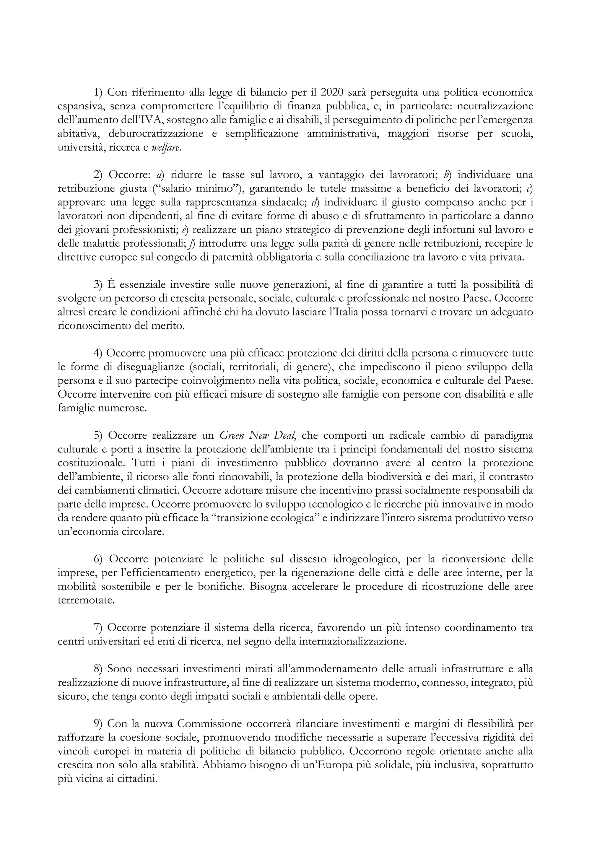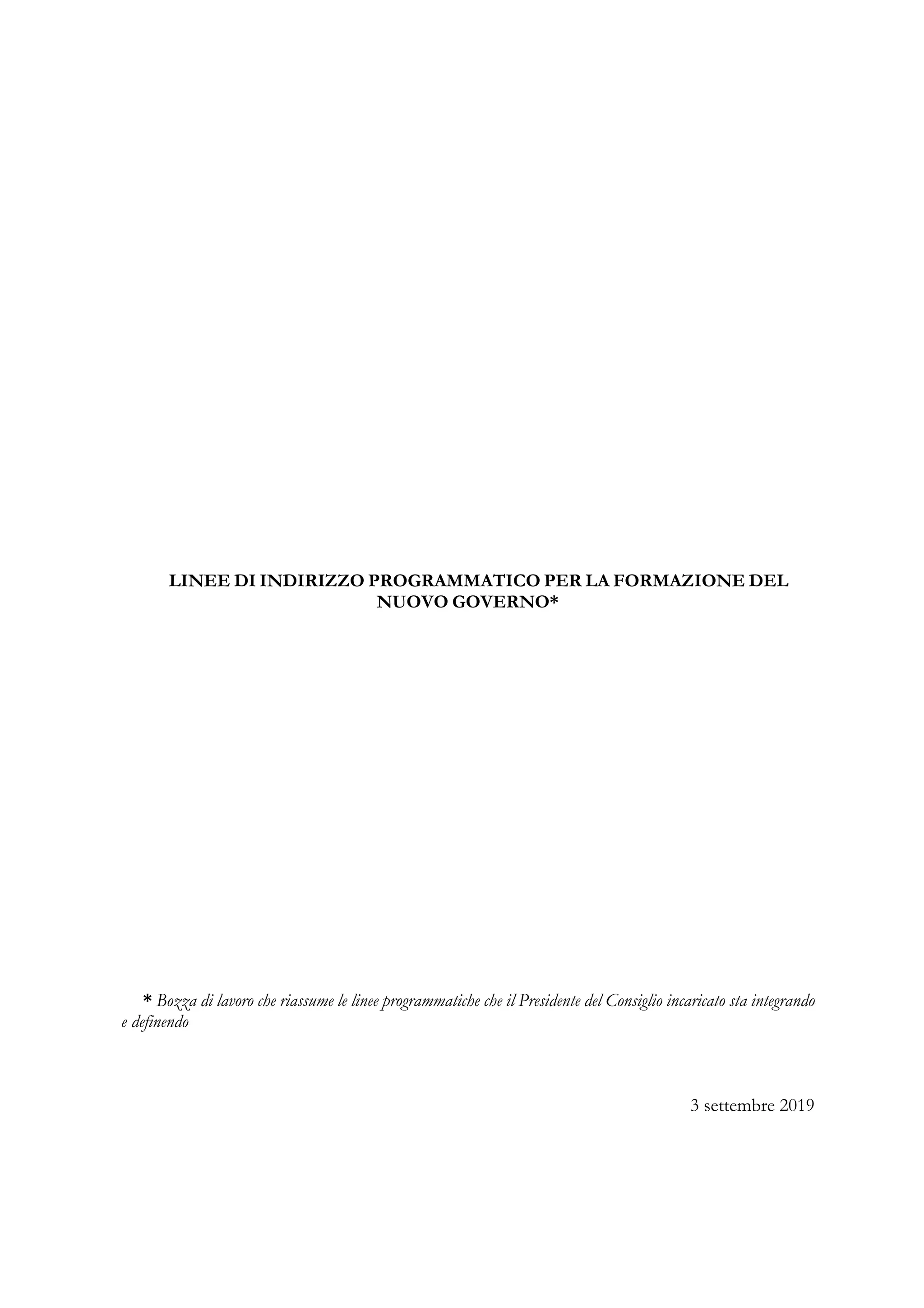 Il documento delinea le linee di indirizzo programmatico per la formazione del nuovo governo, con un focus su una politica economica espansiva, riforme fiscali, e promozione dell'inclusione sociale. Sottolinea la necessità di investire nella formazione, nella ricerca, e nella sostenibilità ambientale, oltre a misure per garantire diritti e uguaglianza. Propone infine interventi per il miglioramento delle infrastrutture e la promozione del turismo, evidenziando l'importanza di una governance più inclusiva e solidale.