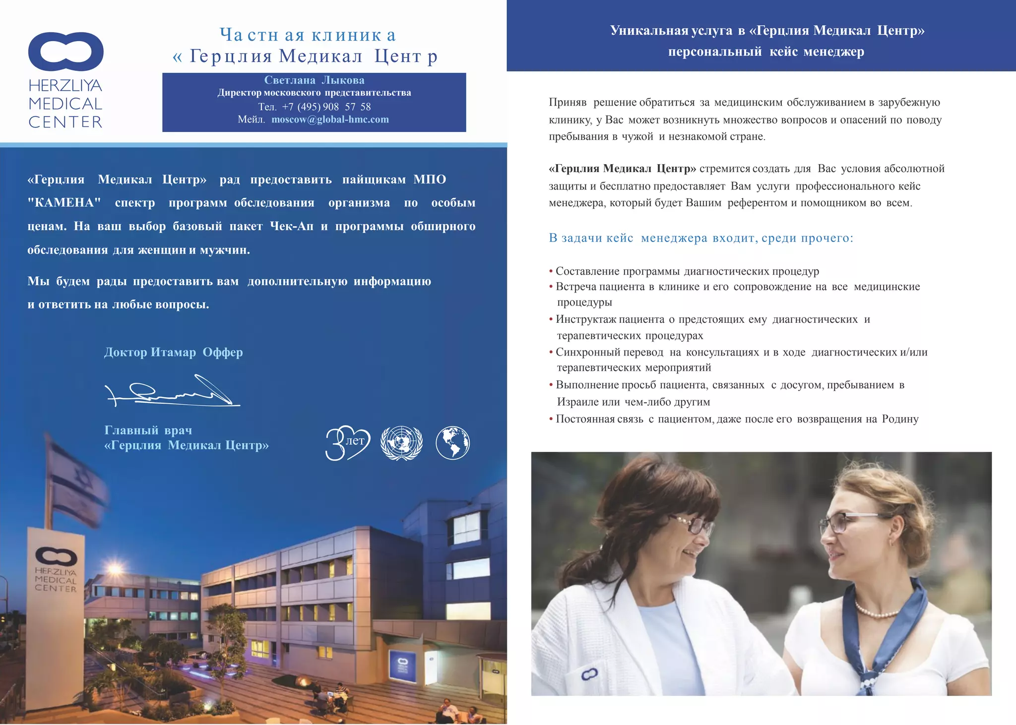 Частная больница «Герцлия Медикал Центр» в Израиле предоставляет широкий спектр медицинских услуг, включая диагностику, консультации специалистов и терапевтические процедуры с индивидуальным подходом. Она предлагает уникальные услуги, такие как персональный кейс-менеджер и программы медицинского туризма, чтобы обеспечить комфорт и защиту пациентам, обращающимся за лечением из-за границы. В клинике доступны различные пакеты обследований и программ ранней диагностики, включая онкологические тесты с использованием современного оборудования.