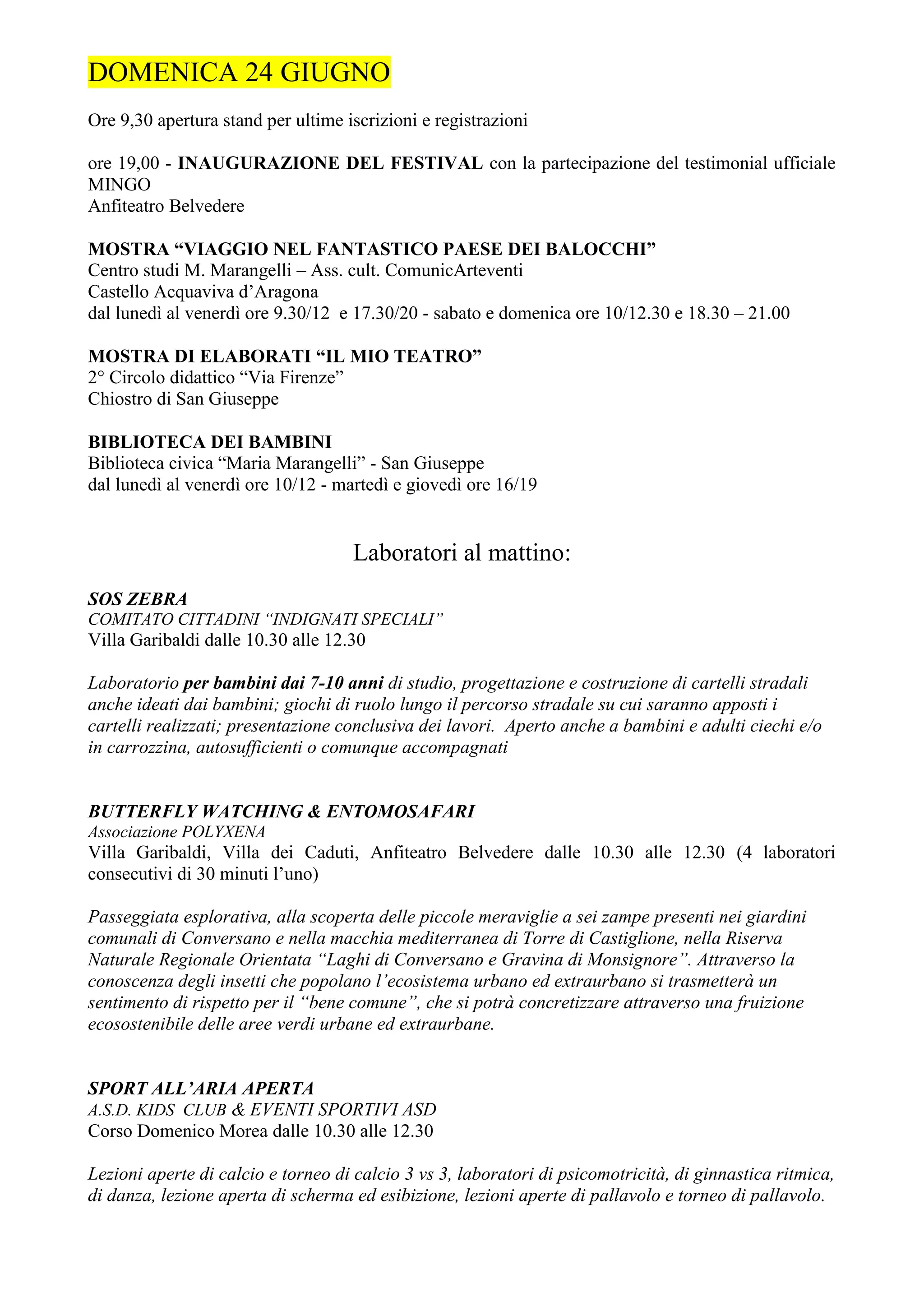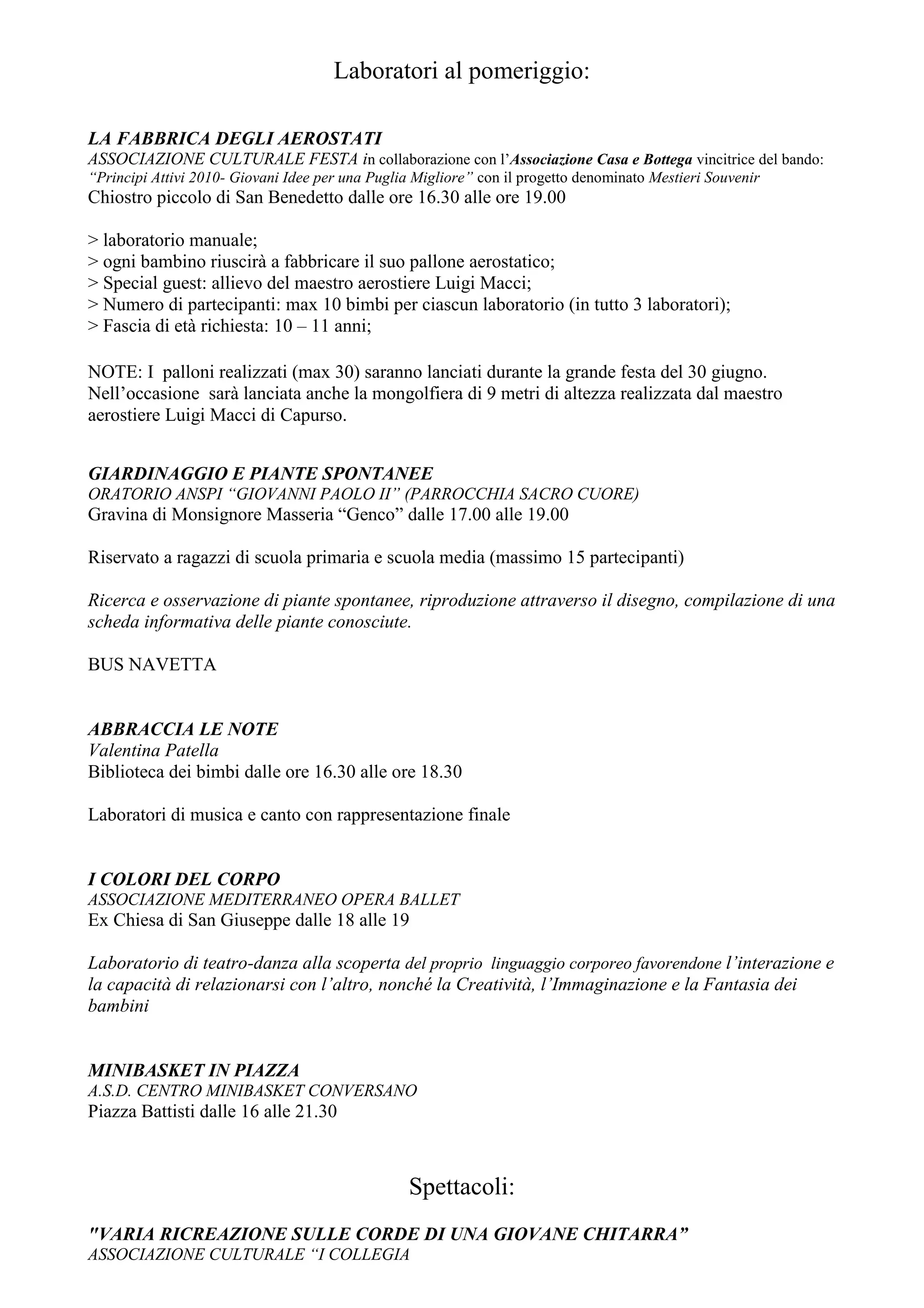 Il documento descrive un festival che si svolgerà a Conversano, con attività per bambini e adulti, tra cui laboratori creativi, spettacoli teatrali e musicali, e eventi sportivi all'aperto. Le attività si svolgeranno in vari luoghi, tra cui biblioteche, chiostri e piazze, e includeranno anche laboratori di giardinaggio, cucina e arte. Il festival culminerà con una grande festa finale il 30 giugno, durante la quale verranno presentati alcuni dei progetti realizzati durante gli eventi.