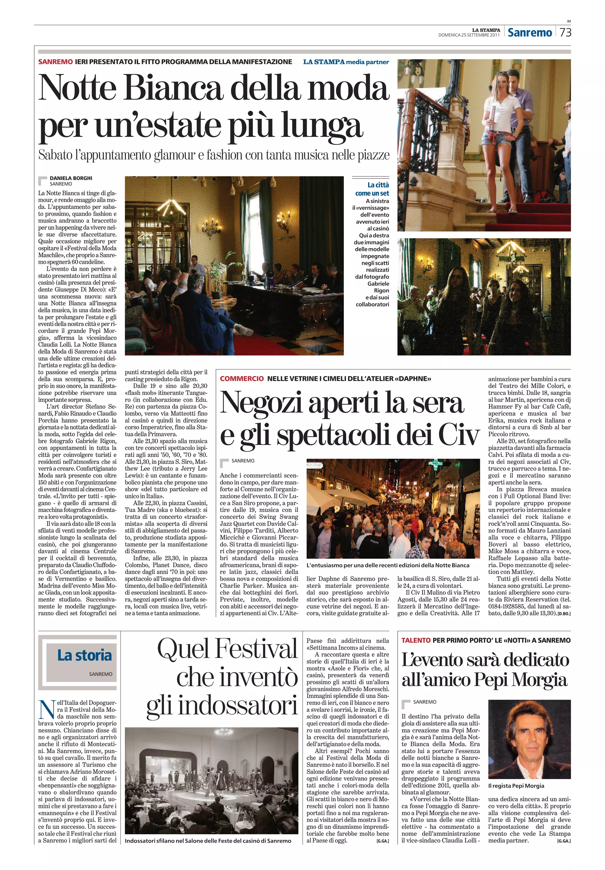 Il 25 settembre 2011, Sanremo ha presentato il programma della sua Notte Bianca della Moda, un evento che combina moda, musica e animazione per prolungare l'estate. La manifestazione include sfilate, concerti e attività per bambini, rendendo omaggio all'artista Pepi Morgia, che ha avuto un importante ruolo nella storia della moda a Sanremo. Tutti gli eventi sono gratuiti e coinvolgono vari commercianti e artisti locali.