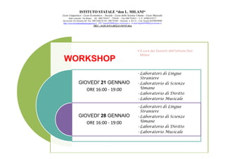 Il documento tratta delle attività dell'Istituto Statale 'Don L. Milani', includendo dettagli sulla sede centrale e la succursale, oltre a informazioni sui laboratori e workshop offerti agli studenti. Sono previsti laboratori di lingue, diritto e musica, e mini stage introduttivi ai corsi di studio. Le attività mirano a coinvolgere gli studenti in esperienze pratiche e interattive per facilitare l'apprendimento.