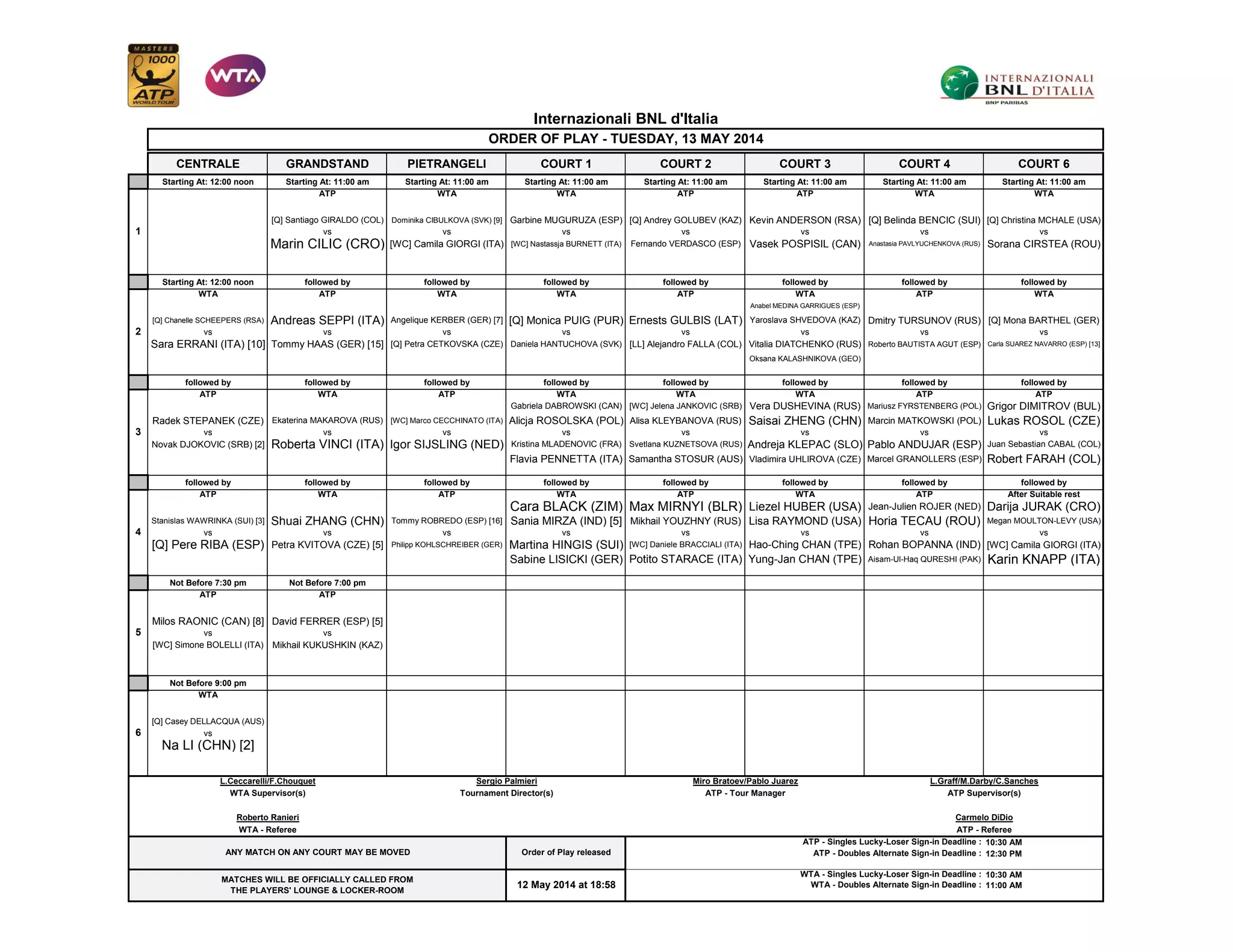 This document provides the order of play and schedule for matches taking place on Tuesday, May 13th at the Internazionali BNL d'Italia tennis tournament. Singles and doubles matches for both the ATP and WTA tours will be held across 6 courts, beginning at 11:00 am and continuing into the evening. High profile matches include Novak Djokovic playing on Court 1 at 12:00 pm, followed by Stanislas Wawrinka on the same court at 7:30 pm. Na Li and David Ferrer are also scheduled to play later in the evening on Court 1. Tournament personnel and contact information is listed at the bottom.