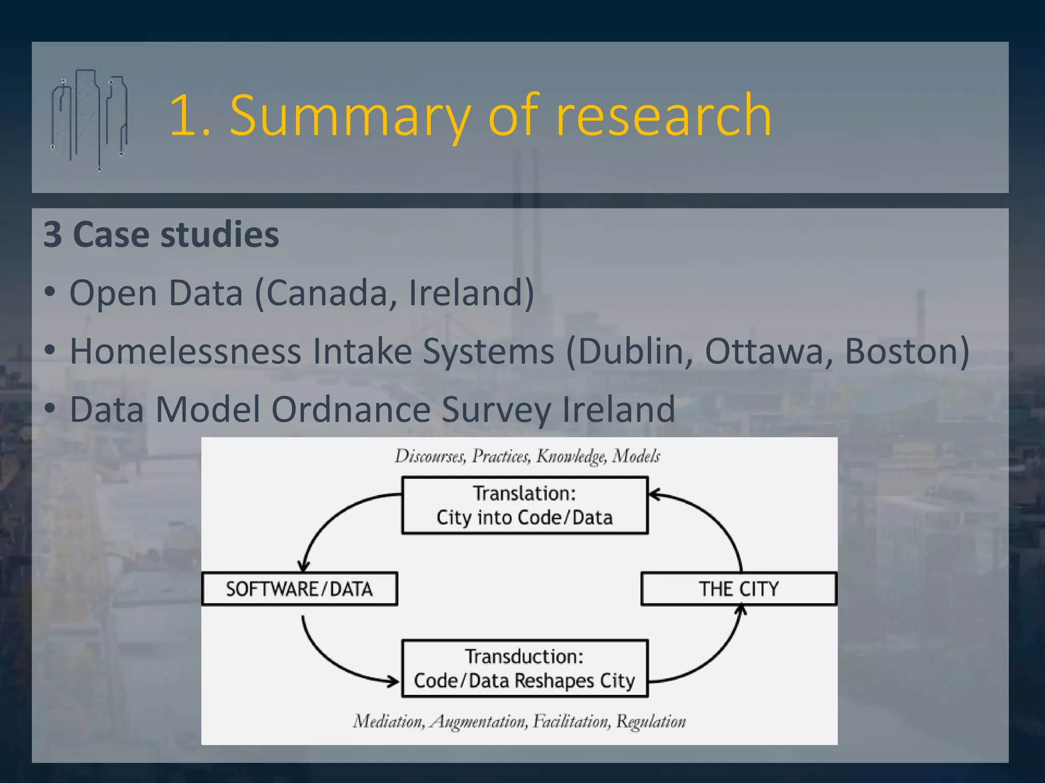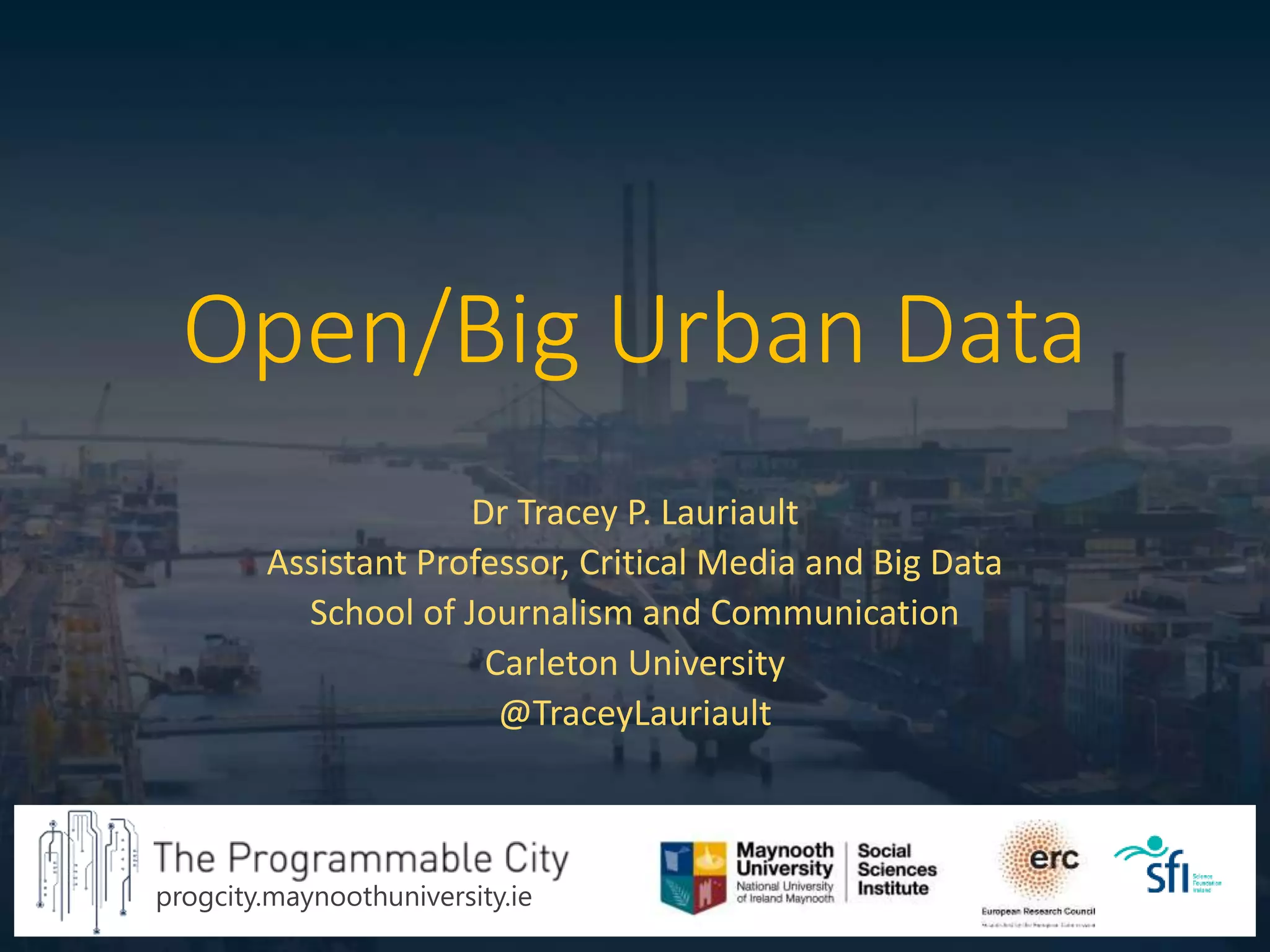 The document discusses the research of Dr. Tracey P. Lauriault on open data and homelessness systems in various cities. Key findings highlight how data cultures influence practices and the importance of integrating homelessness data into broader political and economic frameworks. It emphasizes that data and technology are socially constructed artifacts, which should be mobilized ethically to ensure fair governance in urban environments.