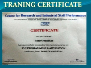 This document discusses Programmable Logic Controllers (PLCs). It provides a brief history of PLCs, describing how they were introduced in the 1960s as replacements for relay logic and have since evolved with the integration of microprocessors. The key components of a PLC like the power supply, processor, I/O modules, and programming device are defined. Common PLC programming languages including ladder logic are explained and examples are provided. Advantages like reliability and flexibility and disadvantages such as proprietary aspects are reviewed. Finally, common industrial applications and leading PLC brands are listed.