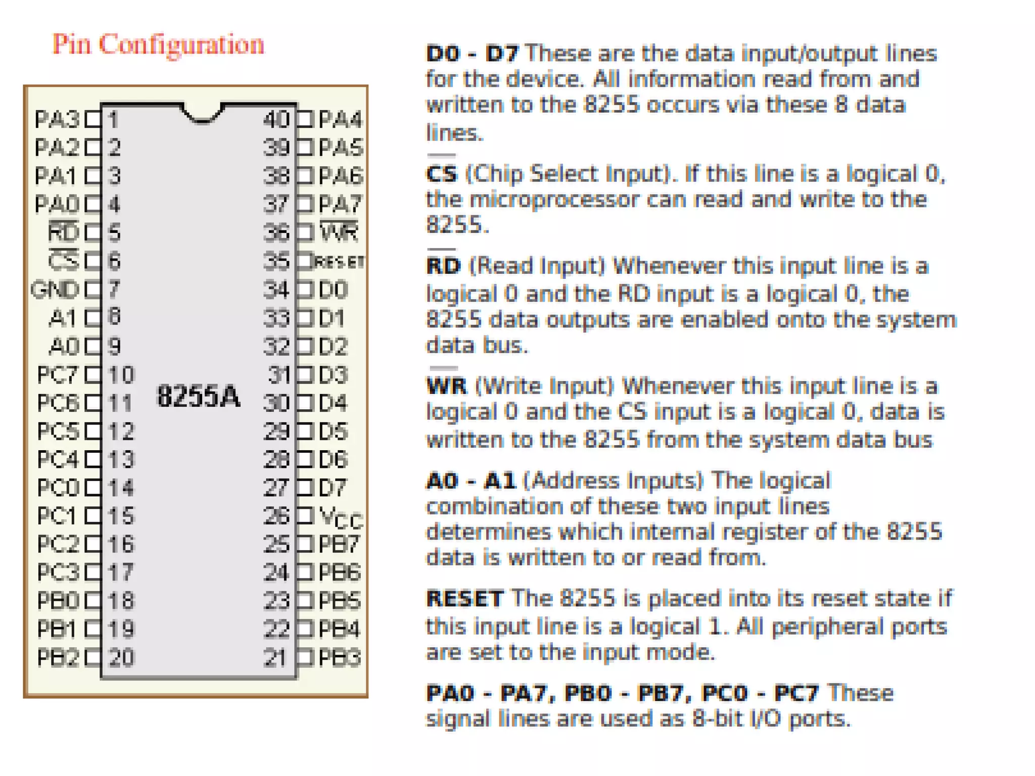 The document discusses the Programmable Peripheral Interface 8255 (PPI), which is an I/O port chip used for interfacing I/O devices with microprocessors. It has 24 pins for I/O that are programmable in groups of 12 pins and has three distinct modes of operation. The PPI is commonly used in microprocessor labs for interfacing experiments and knowledge of it is essential for students. It describes the basic modes of operation and how to program the 8255.