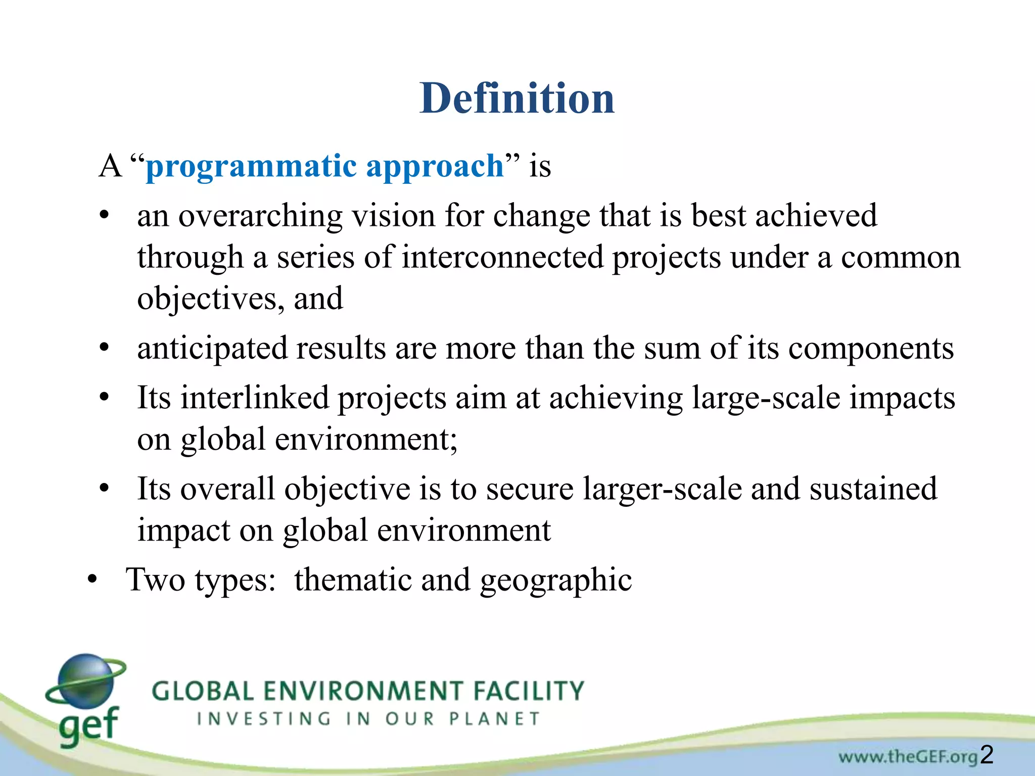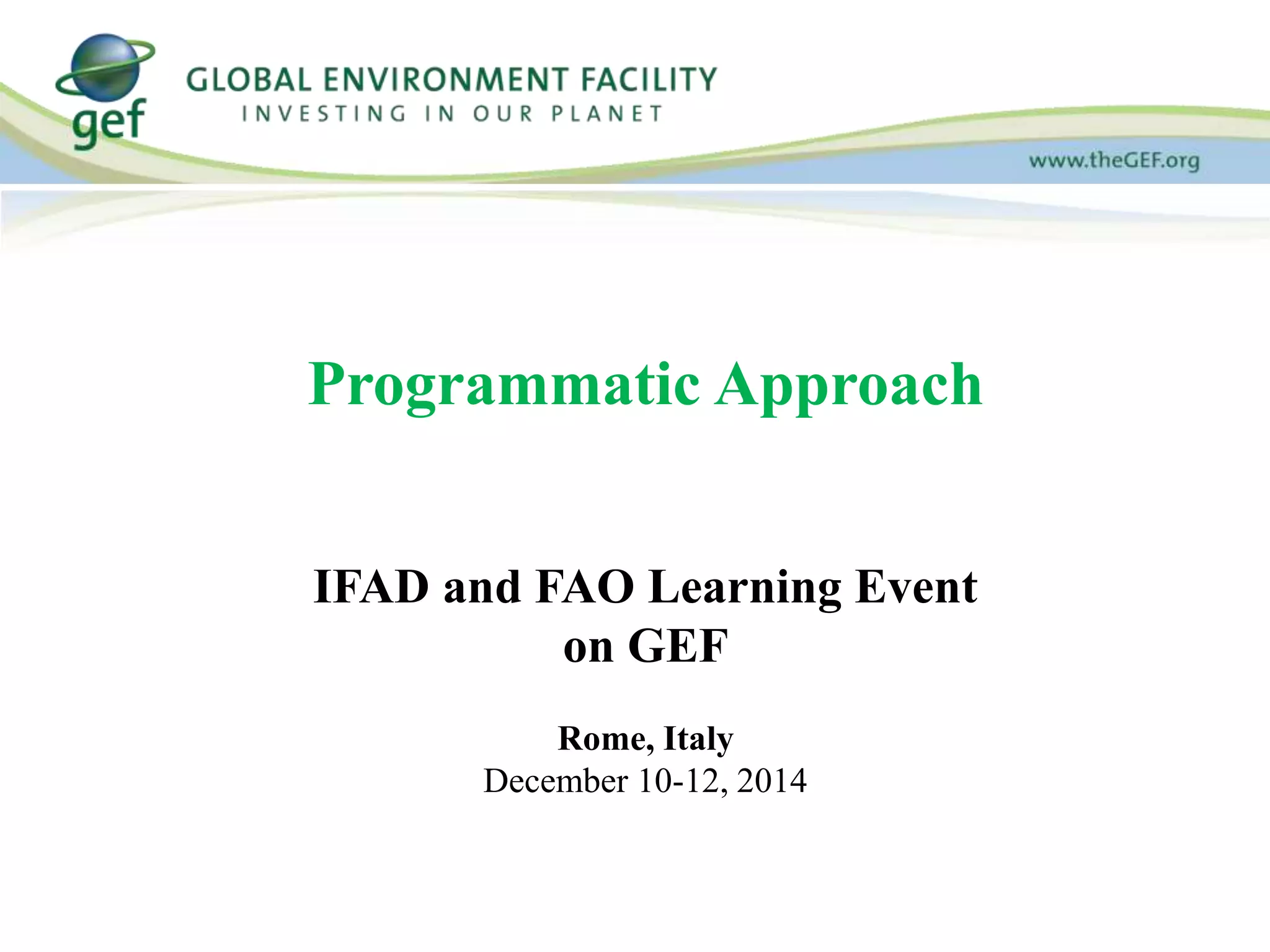 The document defines a programmatic approach as an overarching vision for change achieved through interconnected projects under common objectives. A programmatic approach aims to achieve large-scale environmental impacts through interlinked projects. There are two types of programmatic approaches: thematic and geographic. The approval process for a program involves council approval of a program framework document and CEO endorsement of child projects. Program fees are 9% for programs over $10 million and 9.5% for programs under $10 million. Child projects can receive project preparation grants by submitting a template. The document also outlines program commitment deadlines, cancellation policies, and project preparation grants.
