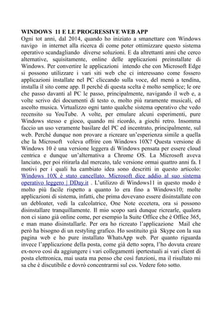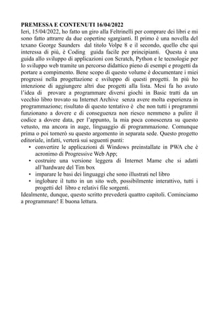 Il documento descrive l'esperienza dell'autore nell'apprendimento della programmazione attraverso il libro 'Coding guida facile per principianti', con focus su Scratch, Python e tecnologie web. Viene delineato un progetto per la creazione di applicazioni web e un portfolio online, documentando i progressi e le difficoltà riscontrate. Inoltre, si discutono argomenti quali la conversione di applicazioni Windows in PWA e l'archiviazione di software su Internet Archive.