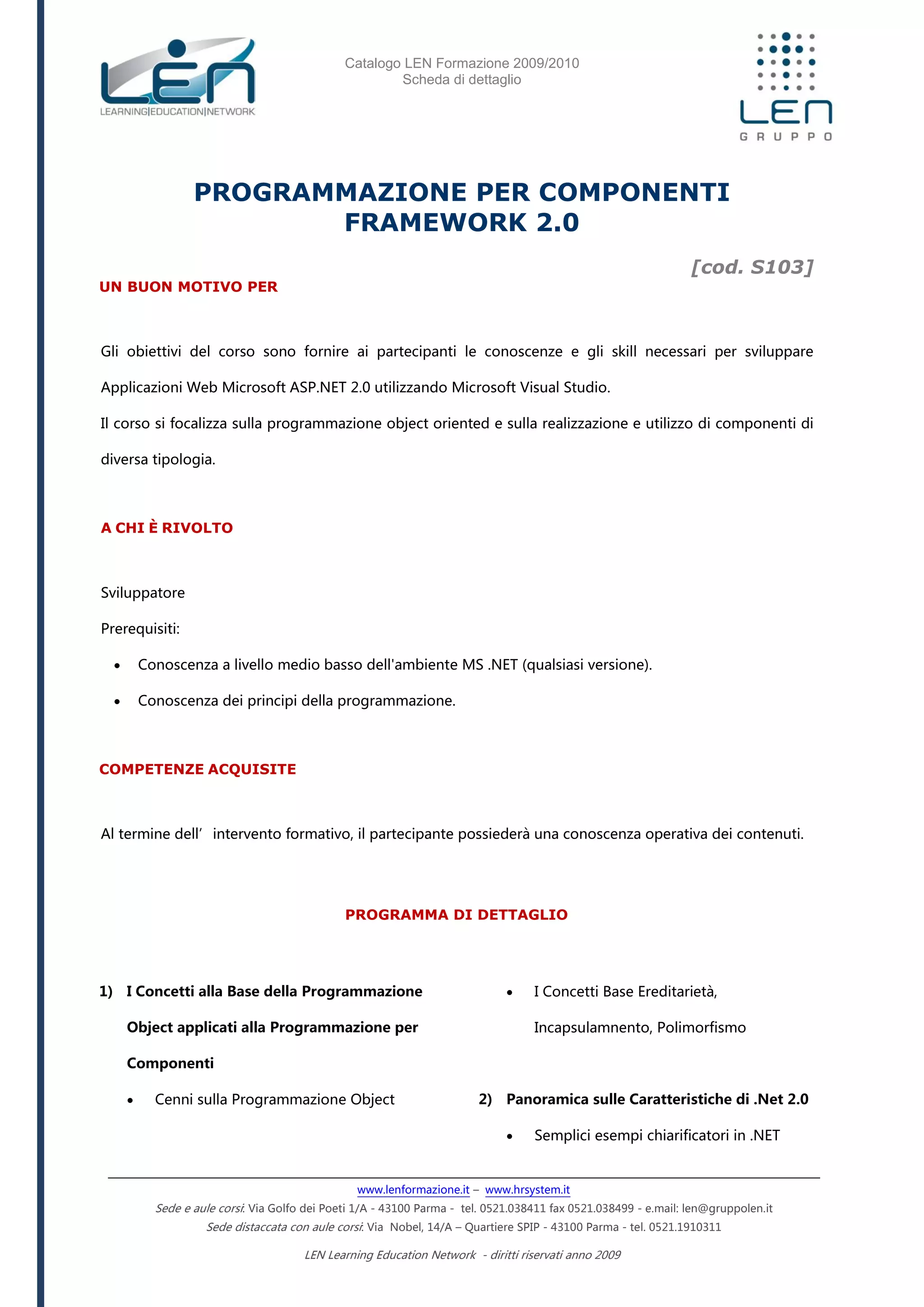Il documento descrive il catalogo della formazione offerta da LEN per l'anno 2009/2010, focalizzandosi su un corso di programmazione avanzata per .NET 2.0, progettato per sviluppatori con conoscenze di base. Il corso offre competenze nella programmazione object-oriented e nella creazione di componenti web, coprendo vari argomenti tra cui librerie di funzioni, web controls e database. Ulteriori dettagli includono le modalità formative e la durata dei corsi, che variano da 3 a 40 ore.