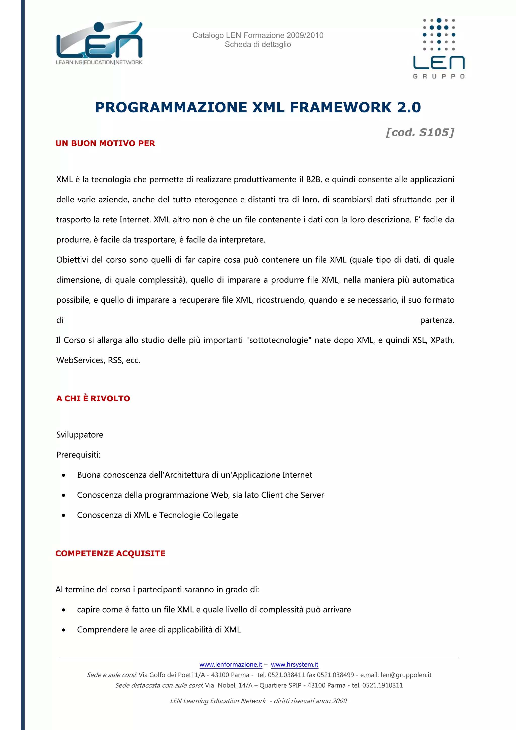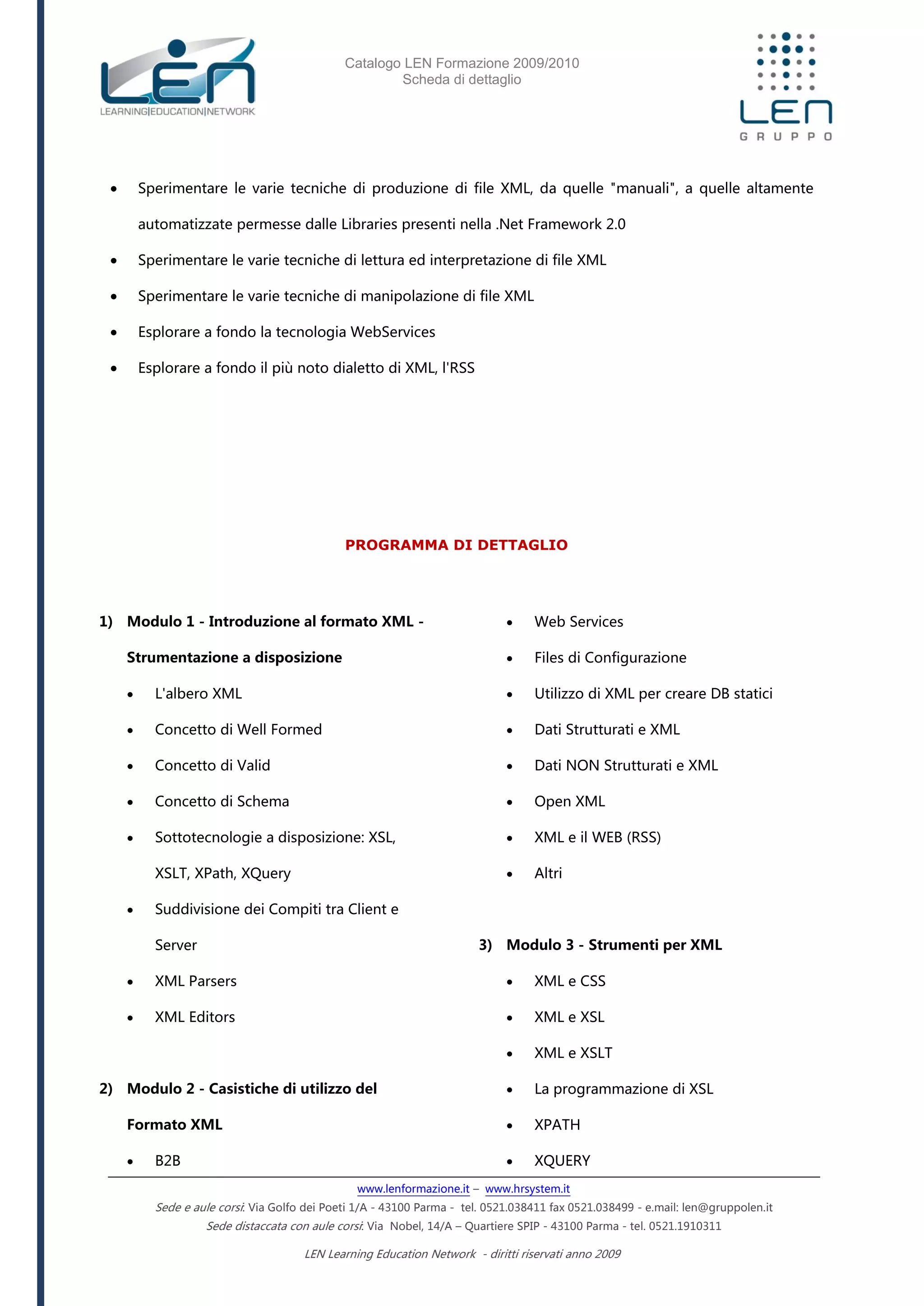 Il documento presenta un catalogo di formazione per il 2009/2010 che riguarda l'utilizzo del formato XML e le tecnologie correlate, con corsi rivolti a sviluppatori. Gli obiettivi includono la comprensione, produzione e manipolazione di file XML, nonché l'esplorazione di sottotecnologie come XSL e Web Services. Il programma è suddiviso in moduli dettagliati, coprendo vari aspetti pratici e teorici del lavoro con XML.