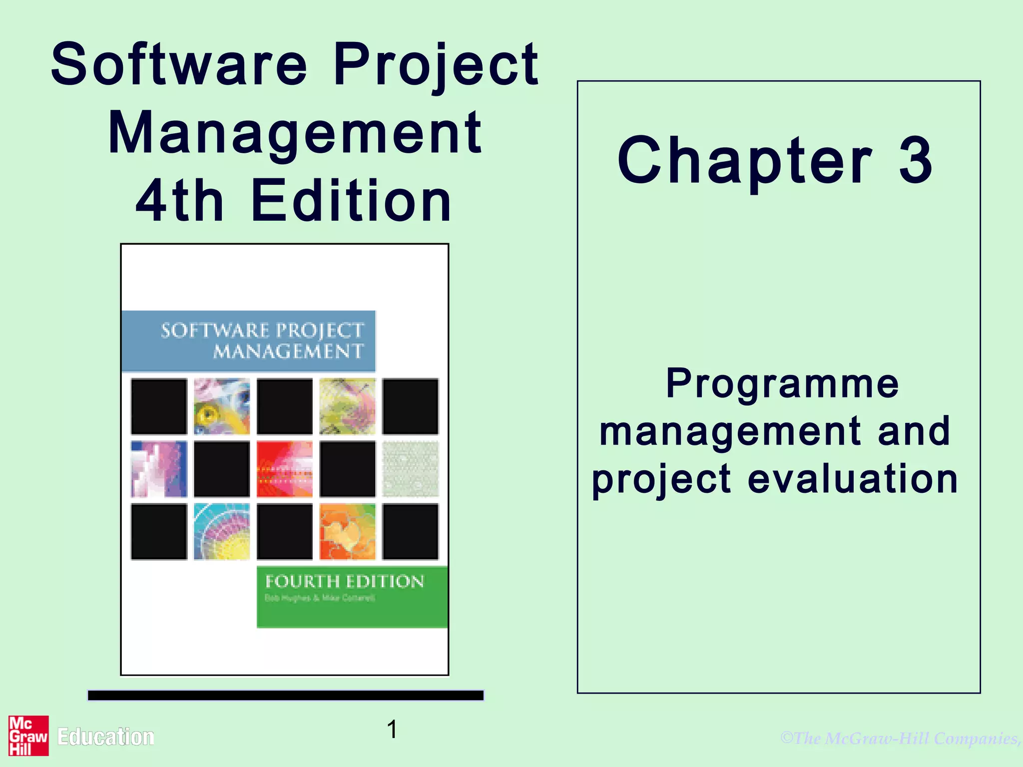 This document discusses programme management and project evaluation techniques. It covers programme management, benefits management, cost benefit analysis, cash flow forecasting and project risk evaluation. Key points include defining programme management as coordinating multiple related projects, identifying expected benefits, quantifying and balancing costs and benefits, evaluating risks, and using techniques like net present value, internal rate of return and decision trees to evaluate projects.