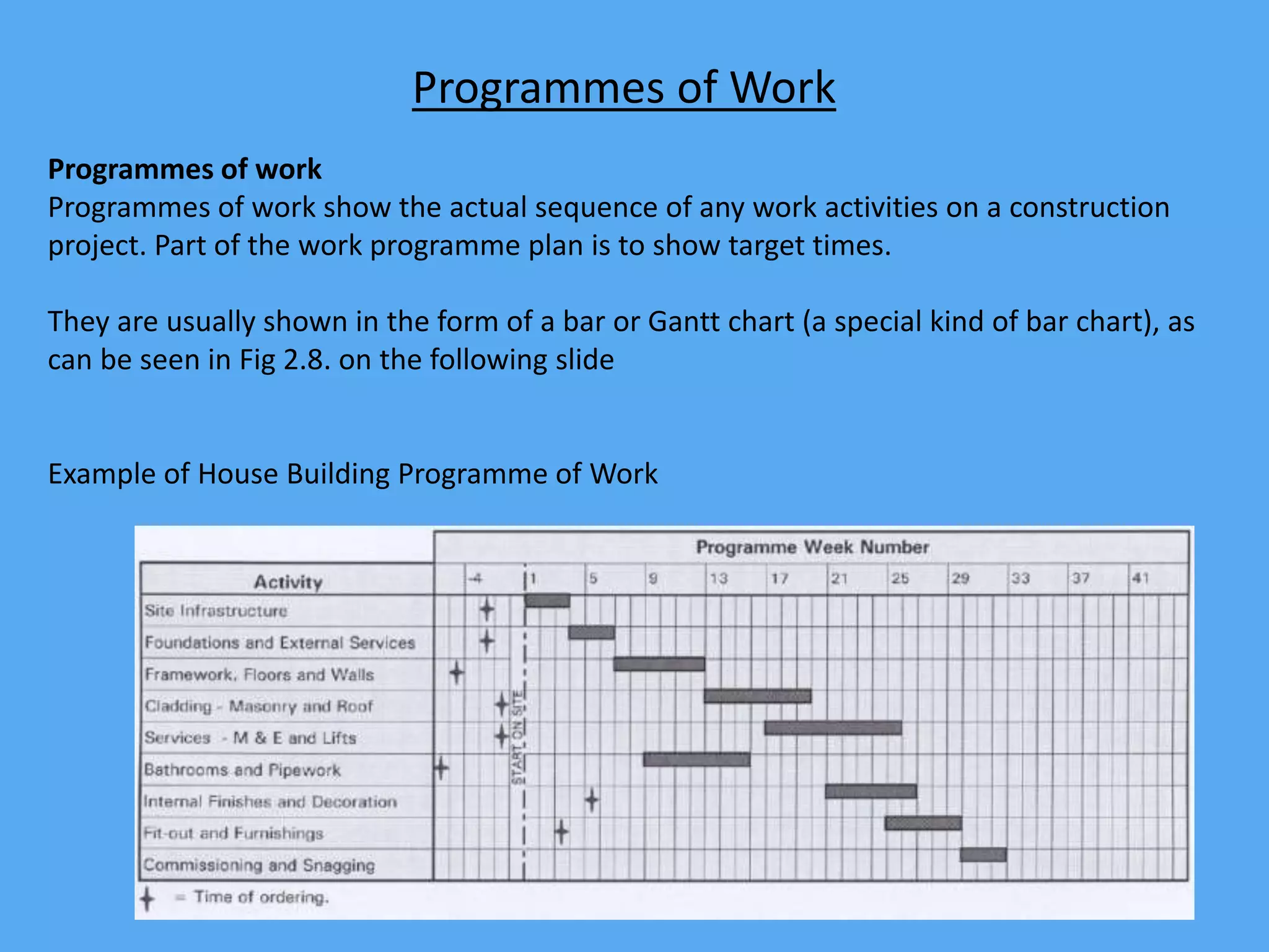 Programmes of work show the planned sequence and target timelines of activities on a construction project. They are typically displayed as bar charts or Gantt charts, with tasks listed on the left and target start and end dates for each shown as blocks on the right. More complex Gantt charts can track actual completion dates against targets, providing visibility into project progress and estimated completion.