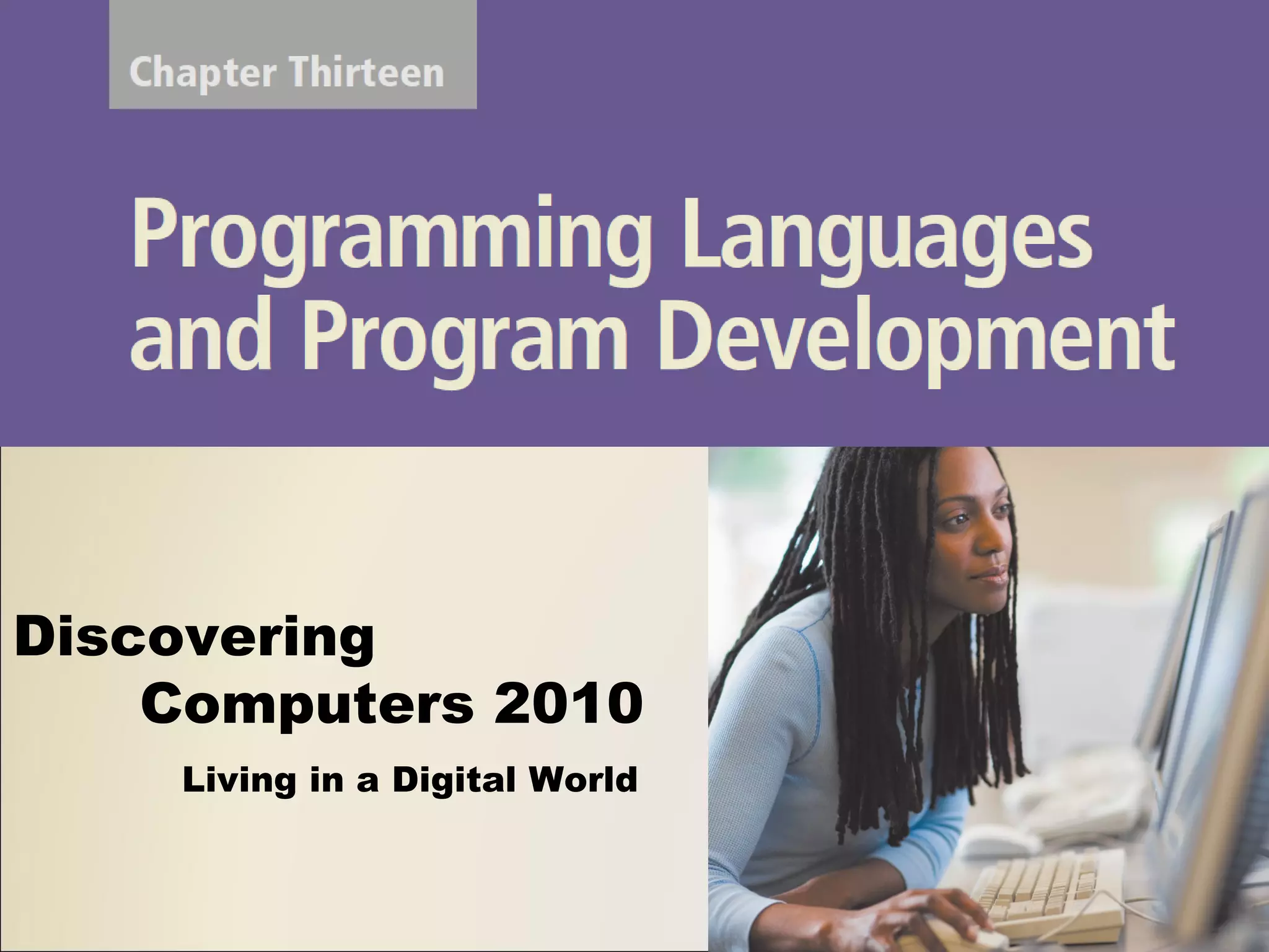 This document discusses computer programming and programming languages. It begins by defining a computer program as a series of instructions that directs a computer to perform tasks. It then covers different types of programming languages from low-level languages like machine language and assembly language to high-level languages like procedural languages and object-oriented programming languages. It also discusses programming tools, web page development, multimedia program development, and the typical steps involved in program development including analyzing requirements, designing the solution, coding, testing, and maintenance.