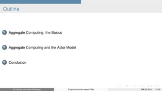 The document discusses the programming of collective adaptive systems using aggregate computing and the actor model. It outlines the principles of aggregate programming, emphasizing decentralized coordination, computational fields, and the integration of actors in distributed systems for IoT applications. The presentation concludes by highlighting the potential future development of frameworks that support scalable computations in these systems.