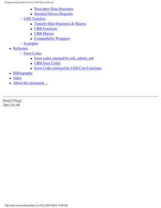 This document provides an overview of programming Linux USB device drivers. It describes the USB specification and topology, including host controllers, devices, hubs, and data transfer types. It also covers USB descriptors, classes, and the Linux USB subsystem framework. Device drivers use the framework to interface with USB devices via descriptors, standard requests, and URB functions and macros for transfers.