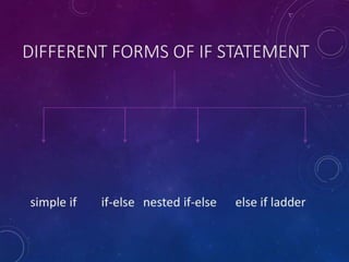 This document provides examples of if, if else, nested if else, and else if statements in C programming. It also includes an example of a switch statement. Each code example is accompanied by its output to demonstrate the logic and flow of each conditional statement type. The examples cover basic conditional checks, nested conditionals, and using else if versus multiple if statements.