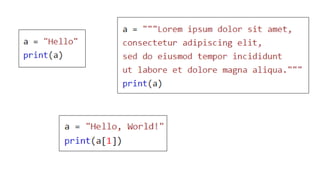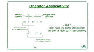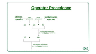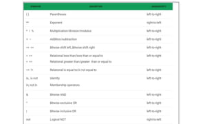 This document discusses Python data types like strings and lists. It explains that strings can be indexed and sliced, and are immutable. Lists can contain heterogeneous data types, are mutable, and also support indexing and slicing. Tuples are similar to lists but are immutable. Basic string and list operations like concatenation, multiplication, appending, and removing elements are demonstrated. The document also covers operator precedence and associativity in Python.