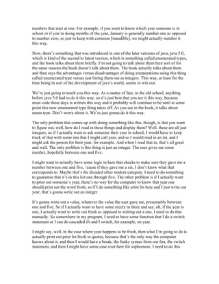 3) The lecture then launches into a discussion of enumeration, explaining that it involves assigning numbers or labels to sets of items to keep track of them in a program.