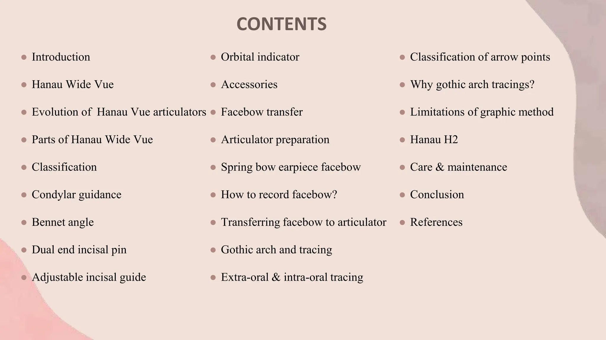 The document discusses the programming of Hanau Wide Vue articulators, including their evolution, parts, and functionalities essential for accurate jaw relation records in dentistry. It details various components such as condylar guidance, adjustable incisal guides, and facebow transfer methods, emphasizing their roles in maintaining oral health and restoring function. Additionally, the document explains the significance of Gothic arch tracing, its classifications, and limitations in capturing mandibular movements for effective treatment planning.
