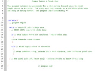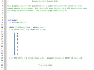 This document discusses programming a robot to drive forward indefinitely but stop and reverse if its bumper switch is pressed. [1] It introduces bumper switches, which output a 1 when pressed and a 0 when not pressed. [2] It presents a flowchart and pseudocode to describe the desired behavior. [3] The flowchart and pseudocode are then expanded on to more accurately represent the logic needed to program the behavior in ROBOTC.