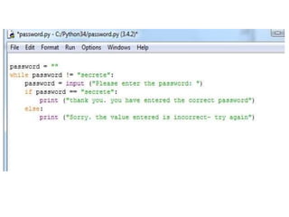 Computer programming involves writing instructions for a computer in a programming language. It is done through programming languages that have specific syntax and keywords. There are low-level languages like machine code and assembly that are closer to what computers can understand directly, and high-level languages that are easier for humans like Python and Java but need to be compiled into machine code. Programs are made up of objects, variables, operations and control flow statements. Programming provides benefits like developing problem-solving skills and is a lucrative career.