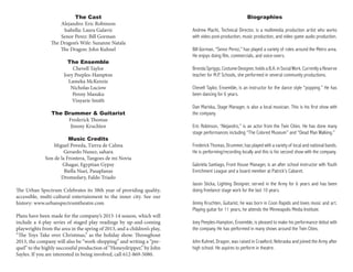 This document provides biographies for the cast and crew of the production "Dragon Feathers", a Bavarian folktale adapted for the stage. It is being produced by The Urban Spectrum theatre company. The production crew includes Lisa Vang as Production Coordinator and Graphic Designer, Dan Mariska as Stage Manager, and Andrew Macht as Technical Director. The cast includes Laura Galaviz as Isabella, Suzanne Natala as The Dragon's Wife, and John Kuhnel as The Dragon. The Urban Spectrum has been providing multi-cultural entertainment in the Twin Cities for 38 years.