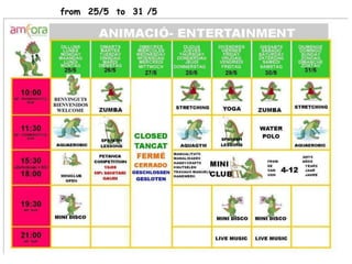 This document outlines an entertainment program schedule for different seasons from May 25th to July 5th. It lists various date ranges and divides audiences into adults and kids sections, suggesting entertainment options are scheduled for different age groups over the multiple week periods.