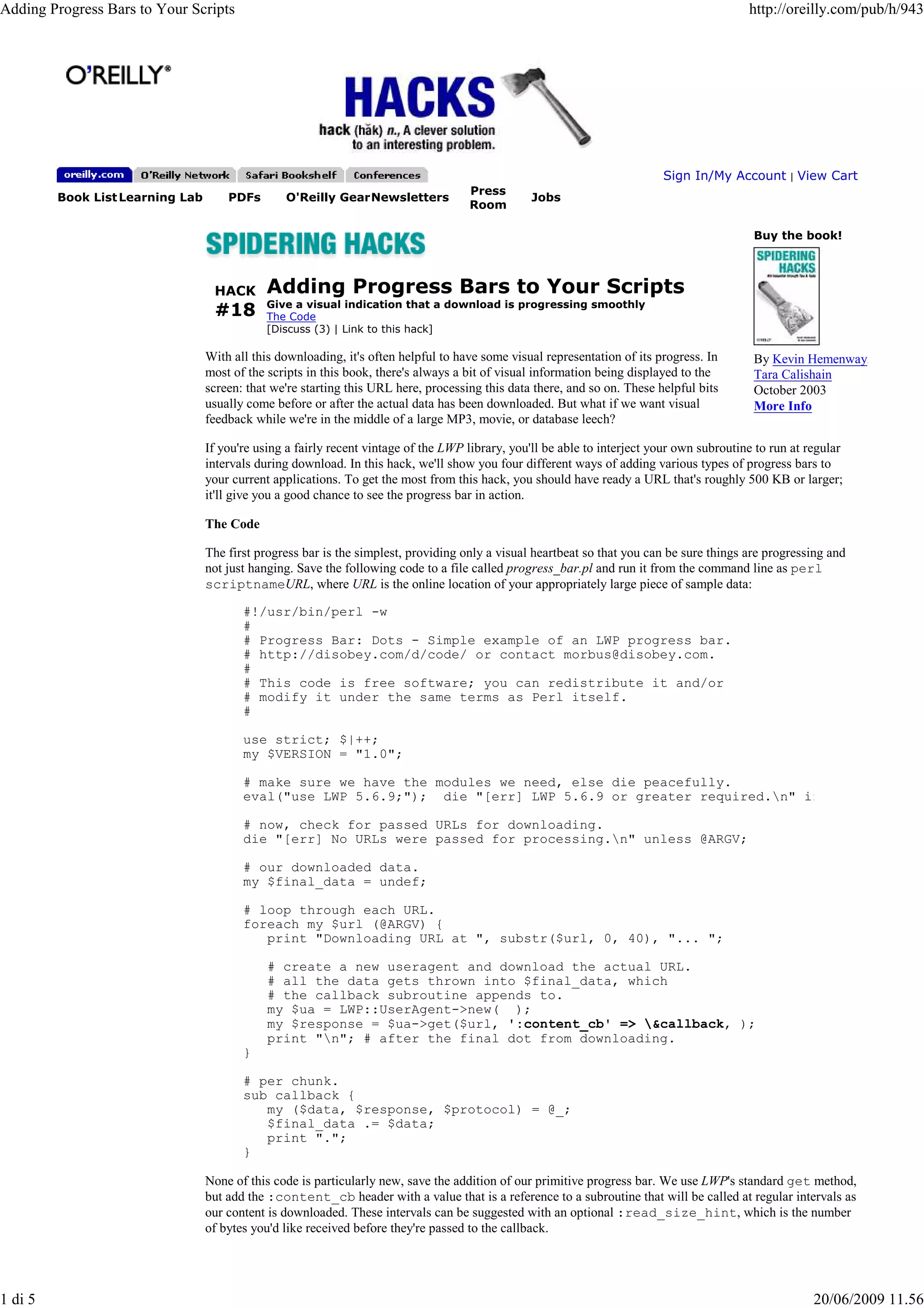 The document describes adding progress bars to scripts to provide visual feedback while downloading large files. It presents four methods of adding progress bars, starting with a simple dot progress bar that prints a dot for each chunk downloaded. This provides a basic heartbeat while downloading but can be disruptive for large files. The document then suggests using an ASCII animation cursor built from characters like \, |, /, - that rotate to provide a more pleasant visual feedback during long downloads.