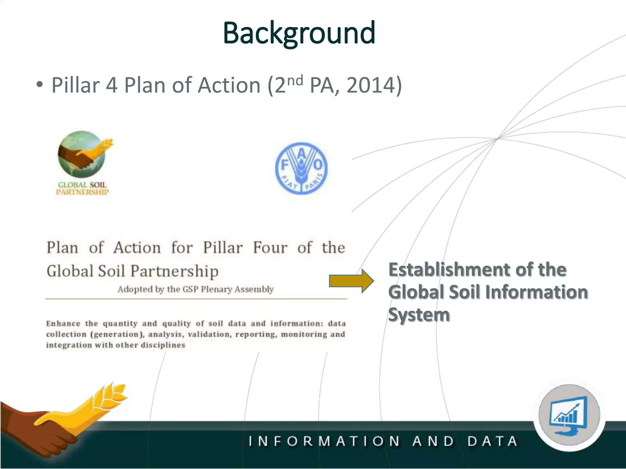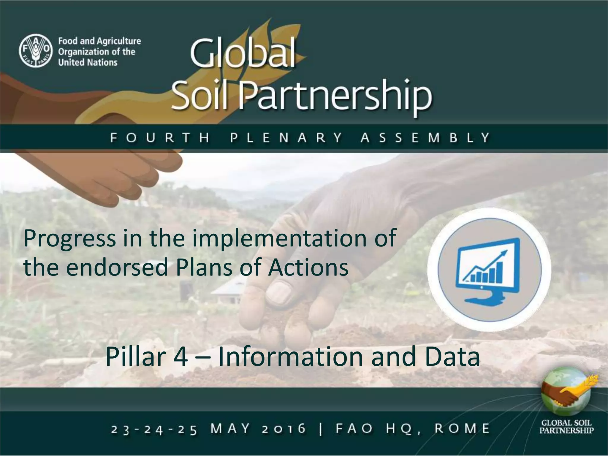 The document outlines progress on Pillar 4 of a Global Soil Information System plan of action. It discusses the establishment of an International Network of Soil Information Institutions to develop and maintain a Global Soil Spatial Data Infrastructure and Global Soil Information System. Near term deliverables include launching a SoilSTAT concept for monitoring soils, developing web platforms and data standards, and convening working groups to begin producing global soil maps, profiles and grids. Execution of the Pillar 4 Implementation Plan is seen as crucial to generating the next State of the World's Soil Resources report and monitoring soils for sustainable development goals.