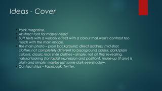 The document outlines design ideas for a rock magazine by Cerys Mee, emphasizing a classic rock aesthetic with specific font, color, and layout suggestions. It includes detailed elements for the cover page, contents, and a double-page spread featuring the artist, along with the necessary photographer credits. The overall theme focuses on a cohesive visual presentation and reader engagement through structured text and imagery.