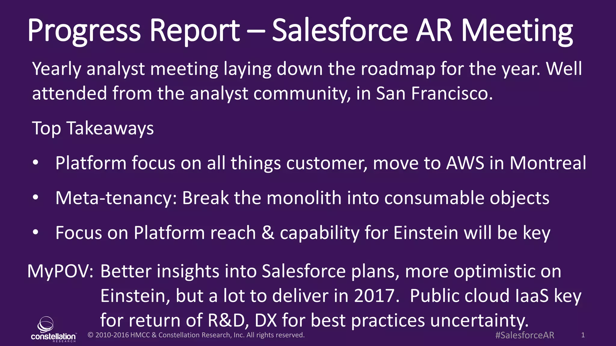 The Salesforce AR progress report highlights an optimistic outlook for 2017, particularly regarding Einstein and the focus on customer-centric solutions. Key insights include a strategic move to AWS, the concept of meta-tenancy for modularity, and an emphasis on enhancing platform capabilities. The yearly analyst meeting set a roadmap with a strong attendance from the analyst community in San Francisco.
