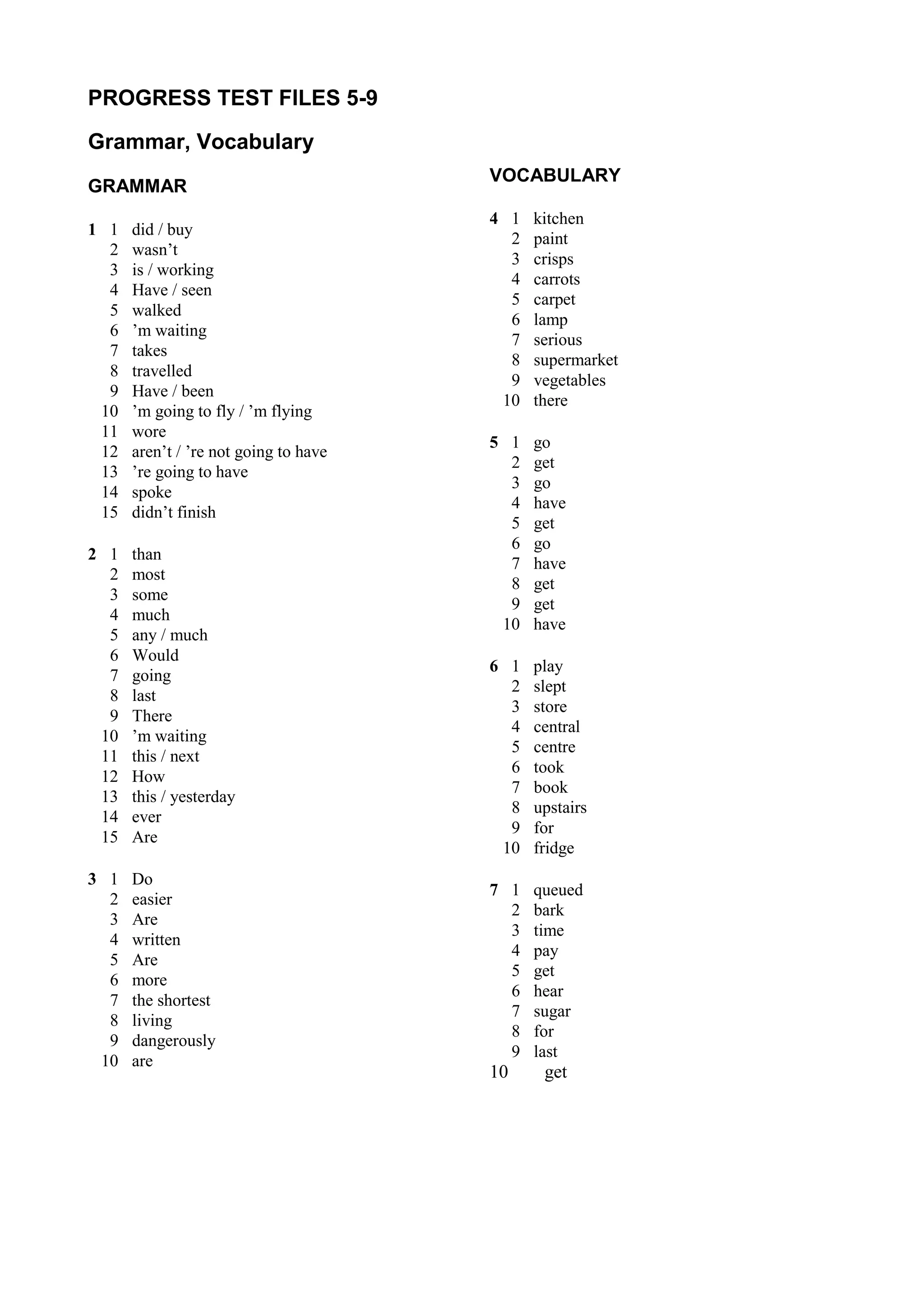 This document contains a progress test covering grammar, vocabulary, and reading comprehension exercises. The grammar section tests usage of verbs, pronouns, adverbs, and word order. The vocabulary questions test common words related to home, food, transportation, and shopping. The reading comprehension passages assess understanding of details, inferences, and main ideas about restaurants, food sourcing, and menus.