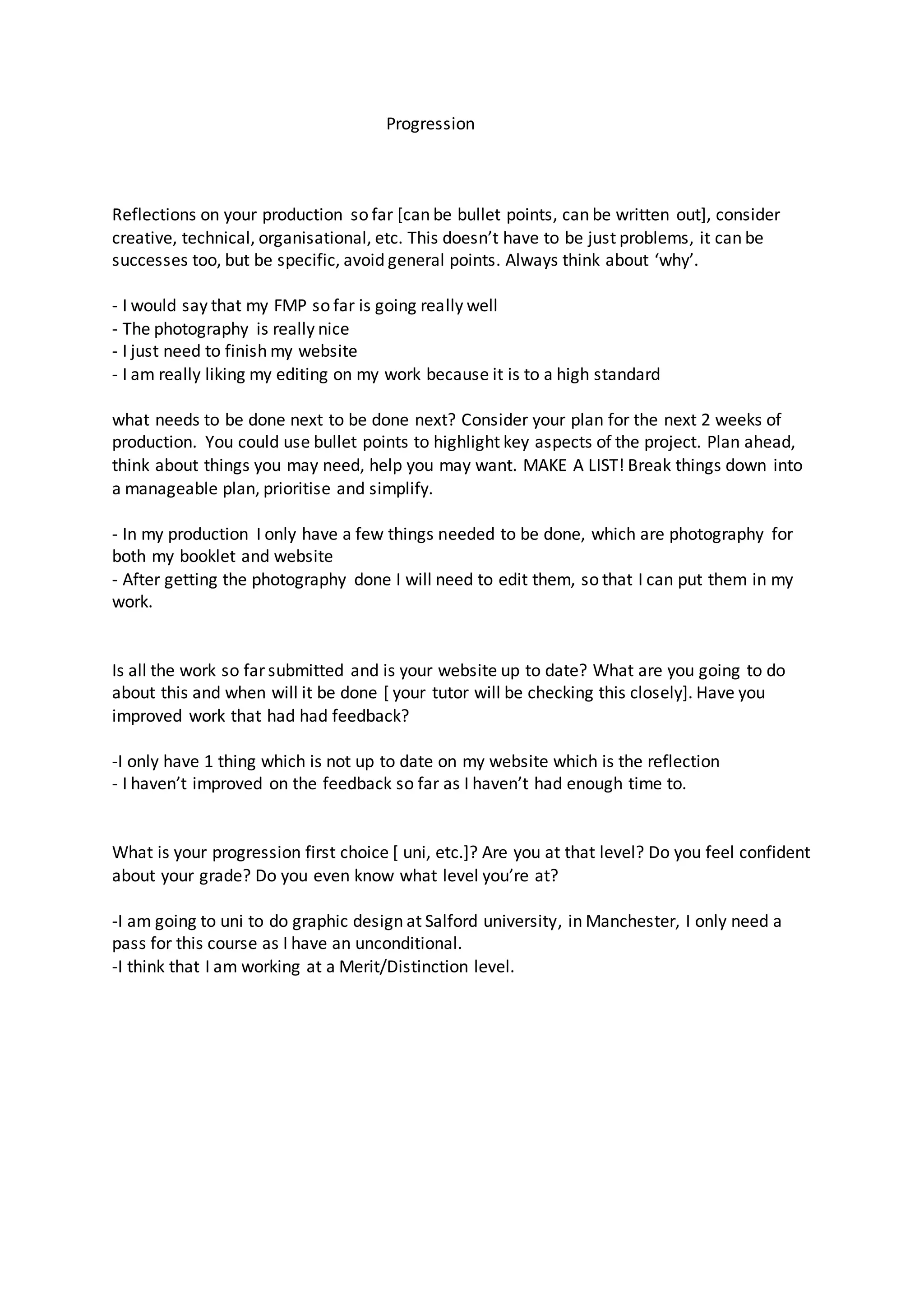 The student reflects on their film production project so far, noting that photography is going well and their editing is to a high standard, but that they need to finish their website. They plan to complete remaining photography and editing for their booklet and website over the next two weeks. Their website is almost up-to-date except for one reflection. They have not yet improved any work based on feedback due to a lack of time. The student aims to study graphic design at Salford University and feels confident they are working at a Merit or Distinction level, having already received an unconditional offer.