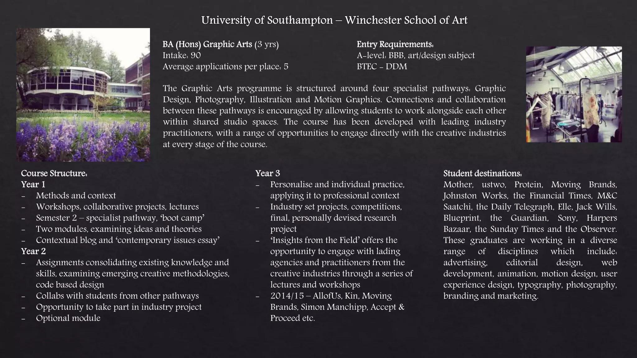 The document provides information about graphic design and related degree programs. It describes the Graphic Arts BA program structure over three years, including pathways in graphic design, photography, illustration and motion graphics. Student destinations upon graduation include jobs at design studios, magazines, and creative agencies. The Graphic Communication Design BA also focuses on developing technical and conceptual skills through industry collaborations and external projects.