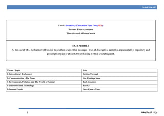The document provides learning progressions for teaching English as a foreign language to first year secondary students in Algeria over the course of the academic year. It outlines five theme-based units to be covered in approximately 28 hours of instruction per unit. Each unit lists targeted competencies, learning objectives, grammar, vocabulary, and phonological points to be covered, as well as suggested tasks and assessments. The document aims to facilitate curriculum implementation and coherence with assessment by focusing on learning pace and prerequisites rather than rigid timelines. Teachers are directed to check prerequisite knowledge and adjust lessons accordingly.