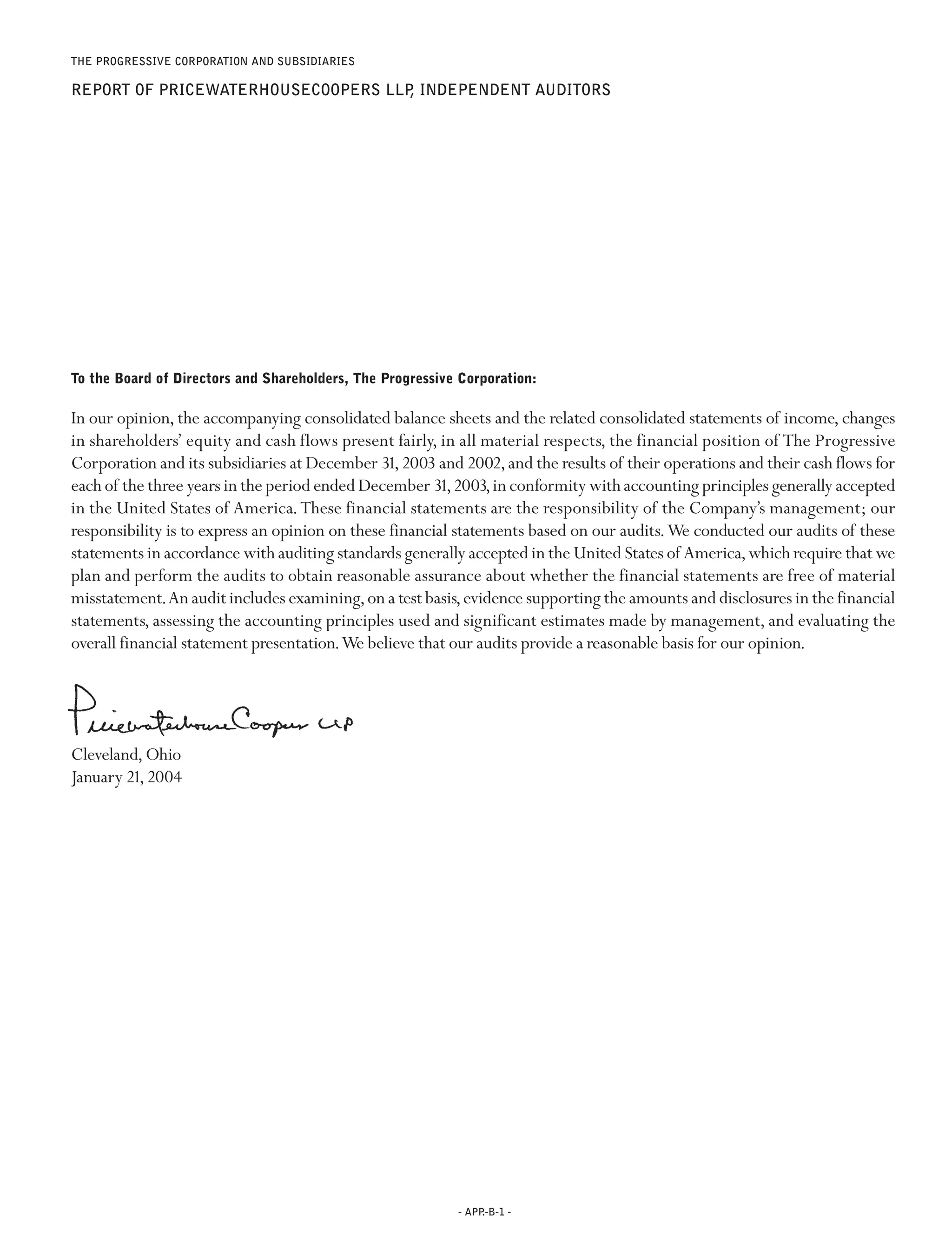PricewaterhouseCoopers conducted an audit of The Progressive Corporation and subsidiaries' financial statements for 2003, 2002, and 2001. PwC issued an unqualified opinion, stating that the financial statements fairly presented the financial position and results of operations in accordance with generally accepted accounting principles. The audit was performed in accordance with generally accepted auditing standards, which included examining evidence supporting the financial statements and evaluating the overall presentation.