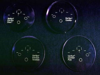 The document discusses progressive addition lenses (PALs), including their design, optics, and benefits over other presbyopia correction options like bifocals. It covers key aspects of PALs such as the distance, intermediate, and near zones; usable fields of view; binocular vision; and peripheral vision. Hard and soft lens designs are compared, as are symmetrical and asymmetrical designs. Factors in lens selection like prescription and lens usage are also summarized.