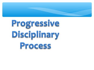 The document provides guidance on progressive discipline policies and processes. It discusses probationary periods and assessments, the progressive disciplinary steps of coaching, written warnings, suspension, and termination. It emphasizes the importance of thorough documentation at all stages of discipline. The goal of progressive discipline is to improve employee performance and compliance with policies, while ensuring discipline is constructive, consistent, and fair.