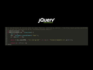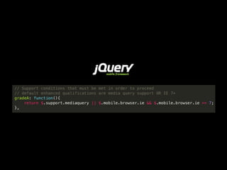 The document discusses progressive enhancement in web development, emphasizing the importance of ensuring functionality across various browsers and networks. It highlights key principles like using HTML for content, CSS for presentation, and JavaScript for behaviors while addressing common pitfalls and performance issues. The author, Zach Leatherman, provides various resources and insights into modern practices, including the use of responsive design and feature detection over user agent sniffing.