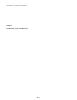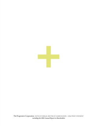 The document is the 2005 annual report and proxy statement for The Progressive Corporation. It includes the consolidated financial statements and notes for 2005, 2004, and 2003. The financial statements show that Progressive's net income increased from $1,255.4 million in 2003 to $1,393.9 million in 2005, while revenues grew from $11,892.0 million to $14,303.4 million over the same period. The notes provide additional details on Progressive's accounting policies, investments, reserves for losses and loss adjustment expenses, debt, and income taxes.