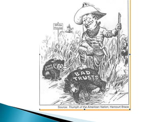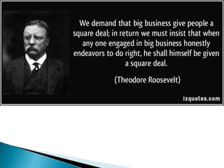 Theodore Roosevelt was the 26th President of the United States from 1901 to 1909. Some of his major accomplishments included trust-busting, bringing over 40 anti-trust suits against large corporations, and establishing numerous national parks and forests. He was succeeded by William Howard Taft, who filed twice as many anti-trust suits as Roosevelt but faced criticism for reversing on tariff reform. Woodrow Wilson was elected as the 28th President in 1912 after splitting the Republican vote between Roosevelt and Taft. As president, Wilson established several progressive reforms including the Federal Reserve Act and the Federal Trade Commission.