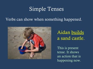 This document explains progressive verb tenses. It defines progressive as referring to actions that take place over time rather than a single moment. The three progressive tenses are the present progressive, past progressive, and future progressive. The present progressive uses a form of "to be" plus the present participle (-ing form) of the main verb to show an ongoing action in the present. The past progressive similarly uses a past tense form of "to be" to refer to ongoing past actions. The future progressive will use "will be" plus the present participle to refer to future ongoing actions. Examples are provided to illustrate each progressive tense.