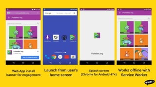 The document discusses the significance of Progressive Web Apps (PWAs) for developers, CEOs, and marketers, highlighting their benefits, such as increased conversion rates and lower bounce rates. It outlines key features of PWAs, like web app manifests and service workers, and emphasizes the need for high performance and re-engagement that native apps typically provide. The document includes statistics showing the growing mobile user base and the advantages PWAs have in terms of user experience and engagement.