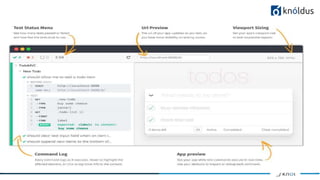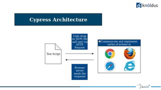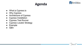 The document presents an overview of Cypress.io, a modern frontend automation testing tool designed for web applications using technologies like ReactJS and Angular. It highlights Cypress's ease of use, unique features compared to Selenium, installation steps, and how to run tests with a focus on JavaScript frameworks. Additionally, it details the structure of the Cypress test runner and its locator strategies for interacting with the DOM.