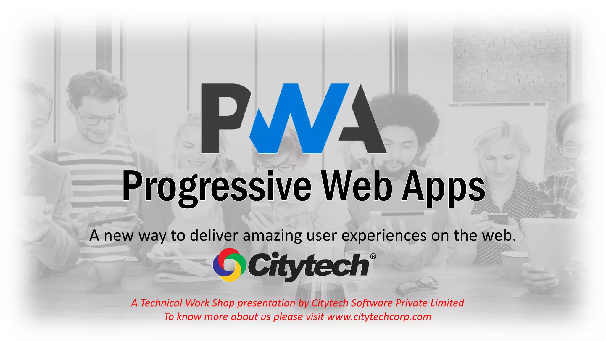 The document discusses Progressive Web Apps (PWAs), which provide app-like experiences on mobile browsers with features like offline access, push notifications, and installability without needing an app store. It covers technical aspects such as the use of TypeScript, service workers, and Firebase for deploying PWAs, along with steps for creating an Angular app and integrating essential components like the manifest and service worker. The presentation by CityTech Software emphasizes the benefits of PWAs and guides users in building and deploying their applications effectively.