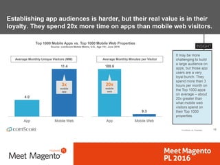 This document discusses progressive web applications (PWAs), which aim to provide users with an app-like experience through the web. PWAs load quickly, work offline or on low-quality networks, feel native on devices, and are discoverable. The key aspects that define a PWA are HTTPS, a web app manifest, and a service worker. Case studies show that popular sites like AliExpress, Flipkart and Google I/O saw significant increases in user engagement and conversion through PWAs compared to regular web or native apps. Service workers allow caching assets, pushing notifications, and handling requests when offline to improve the user experience.