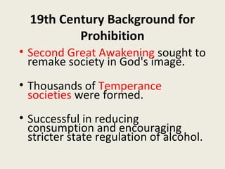 This document summarizes Prohibition in the United States and its repeal via the 21st Amendment. It discusses how the Temperance movement led to the 18th Amendment banning alcohol nationwide in 1919. Enforcement of Prohibition spawned organized crime groups like Al Capone's who profited from bootlegging. Prohibition became unenforceable with widespread corruption and deaths from illegal alcohol. It was repealed by the 21st Amendment in 1933 as the Great Depression increased demand for jobs and tax revenue from legal alcohol. Prohibition failed because it turned law-abiding citizens into criminals and was too difficult to enforce while empowering gangsters.