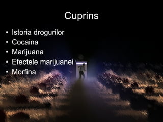 Documentul discută despre droguri și efectele acestora asupra organismului uman, subliniind că drogurile au fost utilizate de-a lungul istoriei pentru diverse scopuri, inclusiv terapeutice. Se analizează droguri comune, cum ar fi cocaina, marijuana și morfina, evidențiind efectele pe termen scurt și lung, precum și riscurile dependenței. Abuzul de droguri este evidențiat ca o problemă socială majoră, având consecințe severe asupra individului și societății în ansamblu.