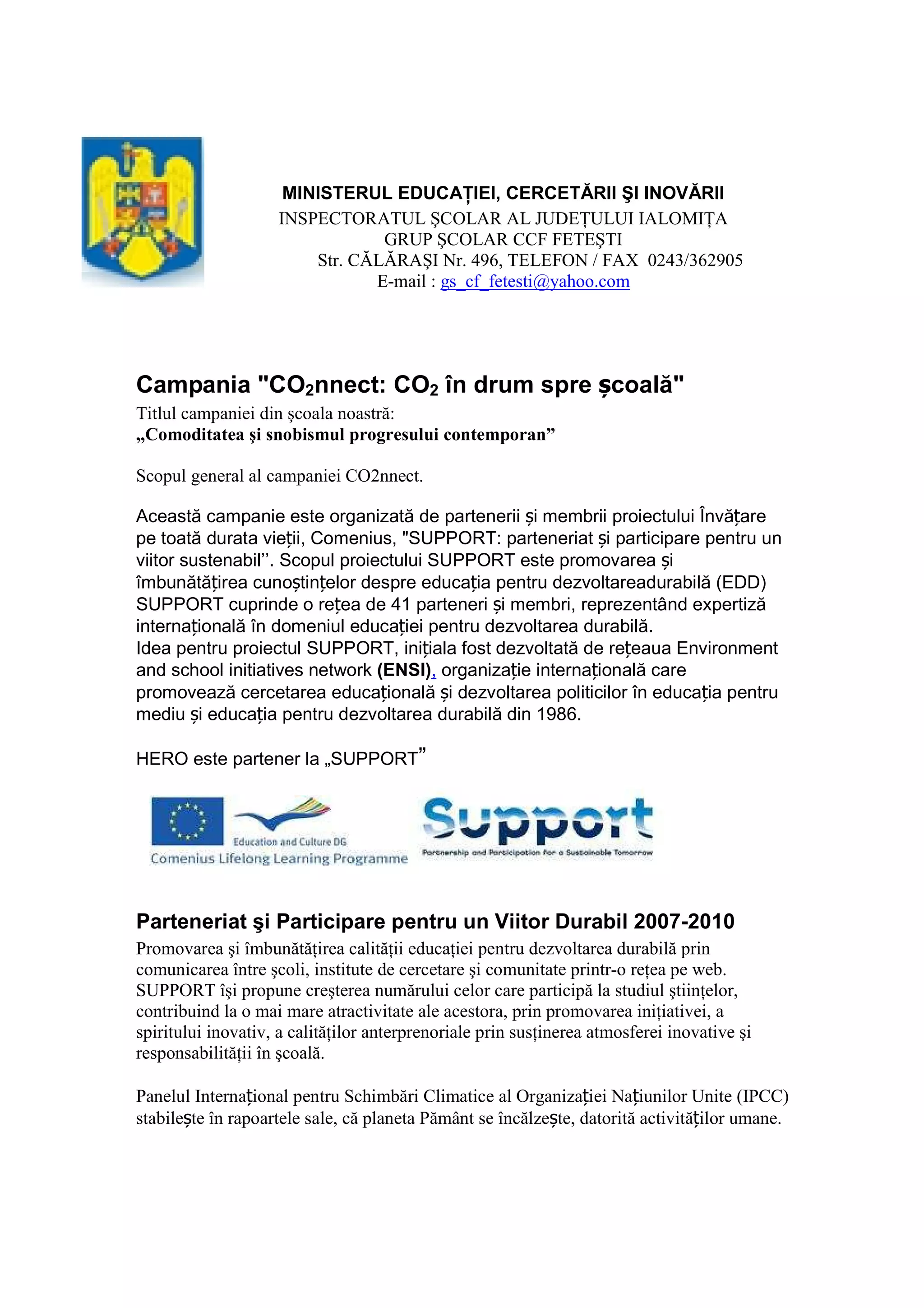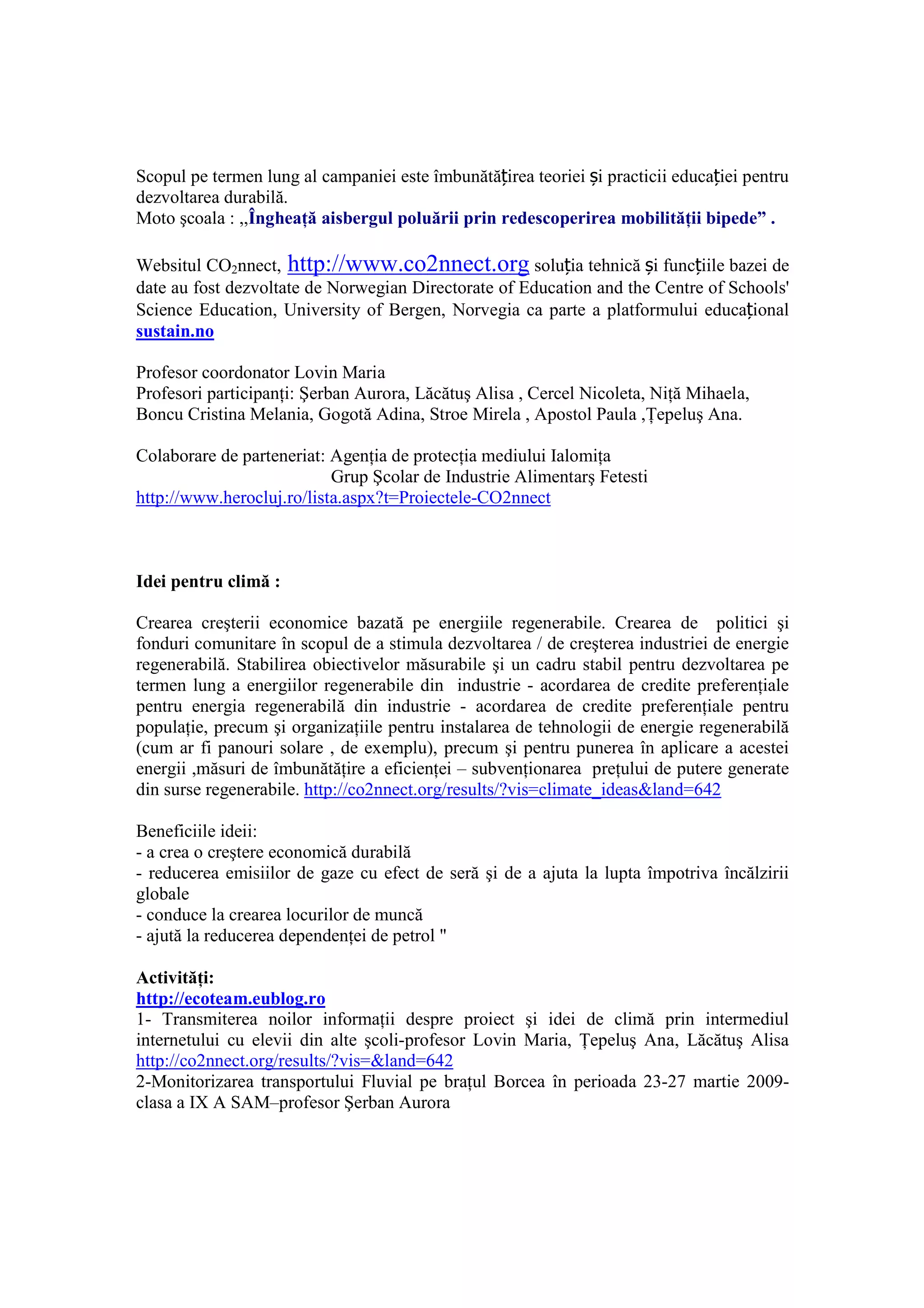 Campania "co2nnect: co2 în drum spre școală" promovează educația pentru dezvoltarea durabilă și conștientizarea impactului emisiilor de CO2 asupra mediului. Aceasta implică activități educaționale și colaborări între școli, profesori și agenții de mediu pentru a încuraja mobilitatea sustenabilă și utilizarea mijloacelor de transport ecologice. Proiectul include diverse activități, cum ar fi lecții despre sursele de CO2 și competiții de ciclism pentru a reduce poluarea.