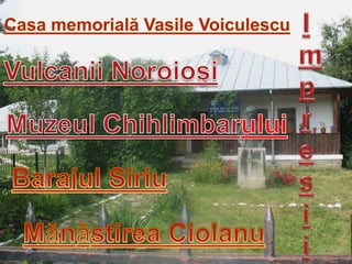 Documentul detaliază diverse atracții culturale și naturale din județul Buzău, inclusiv casa memorială a lui Vasile Voiculescu, care adăpostește o colecție bogată de exponate legate de viața scriitorului, vulcanii noroioși unici din România și muzeul chihlimbarului din Colți, renumit pentru colecția sa rară de chihlimbar. De asemenea, sunt prezentate informații despre barajul Siriu, destinat alimentării cu apă și producerii de energie, precum și despre mănăstirea Ciolanu, un important sit istoric. Aceste locuri oferă atât oportunități de învățare despre patrimoniul cultural, cât și de explorare a naturii.